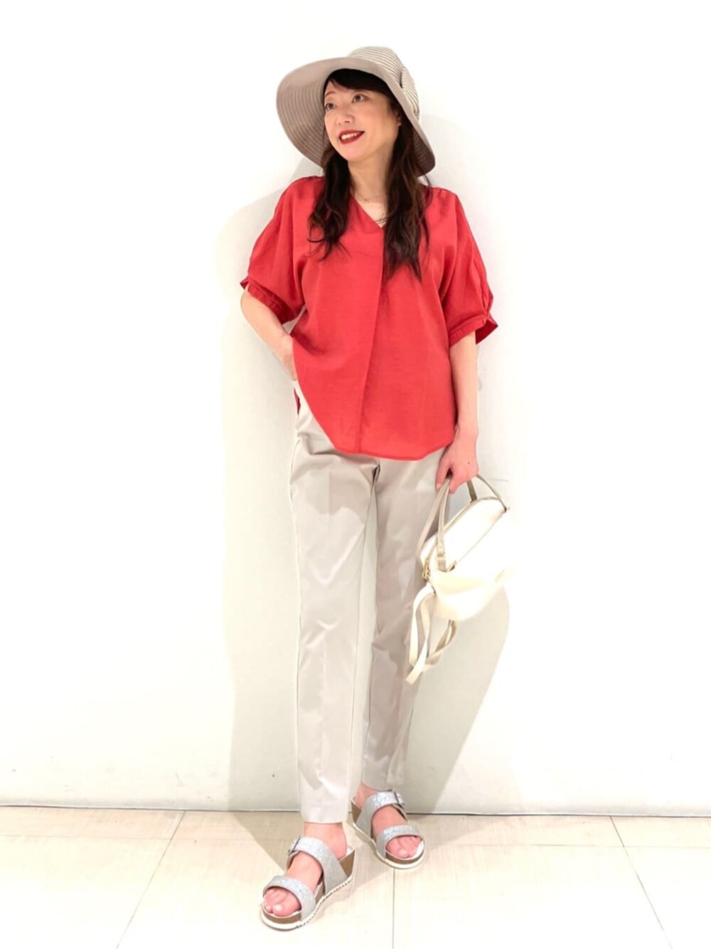 【骨格 ストレート】 初夏のカジュアルスタイル… 軽い素材で体型カバーにもなるトップス。二の腕がフワリと包まれるデザイン。Vネックは顔まわりをシャープに見せてくれます! ラウンドした裾は丁度お尻が隠れる丈感です♪ 合わせたパンツはストレッチ性の高い細身のタイプ… ビックシルエットのシャツと合わせてもバランス良く履いていただけます♪♪♪