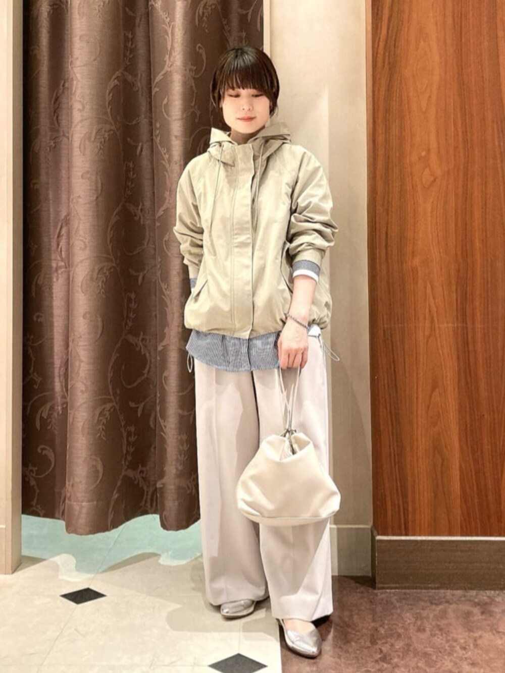 ・マウンテンパーカー サイズ感 丁度良い。ゆとりあり。 お尻が隠れる 着心地・素材感 軽い。ラグラン袖で動きやすい。 柔らかく程よいハリ感 おすすめポイント 袖口内側がゴムで見えない、袖を上げやすくこなれ感が作りやすい。 首元・フードのデザインが綺麗で前を閉めてもおしゃれ◎ コーディネートポイント 前を閉め、裾ゴムをしっかり目に絞ってインナーシャツorロンT見せ。ボトムは綺麗めワイドパンツやロング丈スカートがこなれ感UPのポイント。