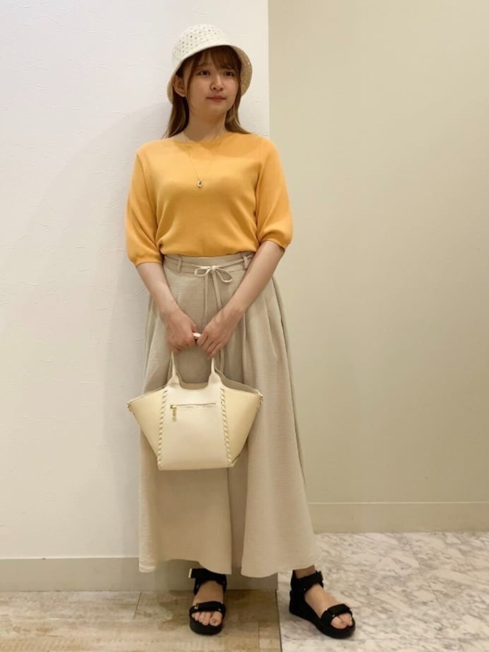 【サイズ感】⠀トップスMサイズ着用でゆったりと着れます。ボトムスもMサイズ着用でウエストゴムなのでピタッときますが窮屈感のないリラックスして着れます。 【素材・着心地】⠀接触冷感のあるトップスでひんやり気持ちいいニットです。 ボトムはリネンライクでサラッとした着心地です。 【おすすめポイント】⠀5分袖なので二の腕カバーにもなりUVカット、毛玉なりにくいおすすめアイテム! お仕事用にも使えるスカーチョでカジュアルスタイルにも使えます! 【スタイリングポイント】 黄色のトップスが引き立つようにボトムや帽子、バッグを白で統一させて夏らしいコーデにしてみました!