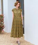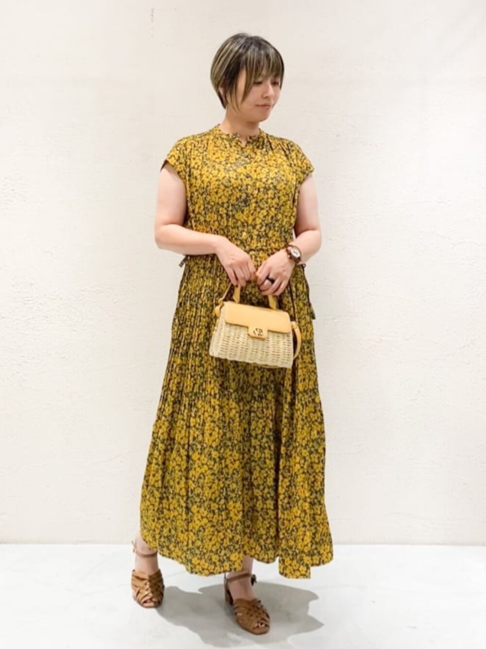 【サイズ感】ゆったりした作り。両サイドのリボンを絞ってウエストの調整が出来ます! 【素材感・着心地】薄手で落ち感がある素材で、サラッとしています。スカート部分は裏地があり、透ける心配はないです☺️ 【オススメポイント】シワになりにくく、軽くて、1枚で着て頂けるので夏の旅行やお出掛けにピッタリ!スカート部分のプリーツは裾に行く程プリーツが消えていくような加工で、キチンと感を残しつつデイリーにも華やか過ぎないデザインとなっています。 【スタイリングのポイント】ワンピースとBAGを向日葵カラーで統一し、夏休みのお出掛けにぴったりな色合いにしました。