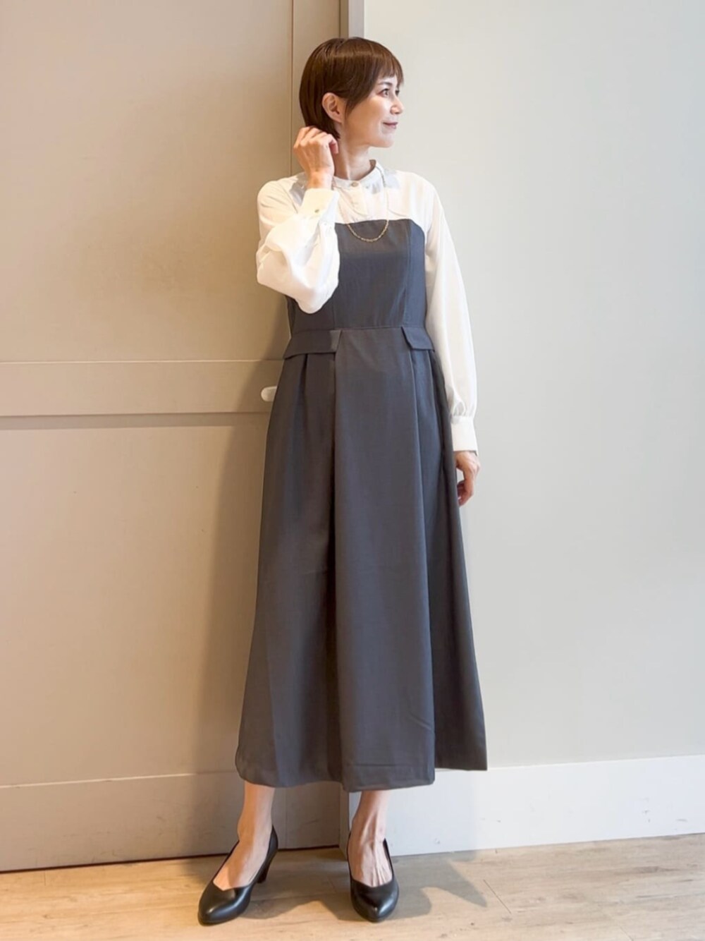 ◆styling point◆ ドッキングワンピは一枚で上品な雰囲気に♪ オフィスシーンにもおすすめの大人っぽく着られる時短スタイル。 ……………………………………………………………………………………… ◆ワンピース 【サイズ感】154cm、Sサイズ着用でジャスト。ミモレ丈。 【素材感・着心地】ゴワつきのない素材感。スッキリした着心地。 【おすすめポイント】お袖ふんわり&ウエスト後ろがしっかりシャーリング。メリハリのあるデザインでスタイルアップ♪低身長さんにもおすすめです^ ^