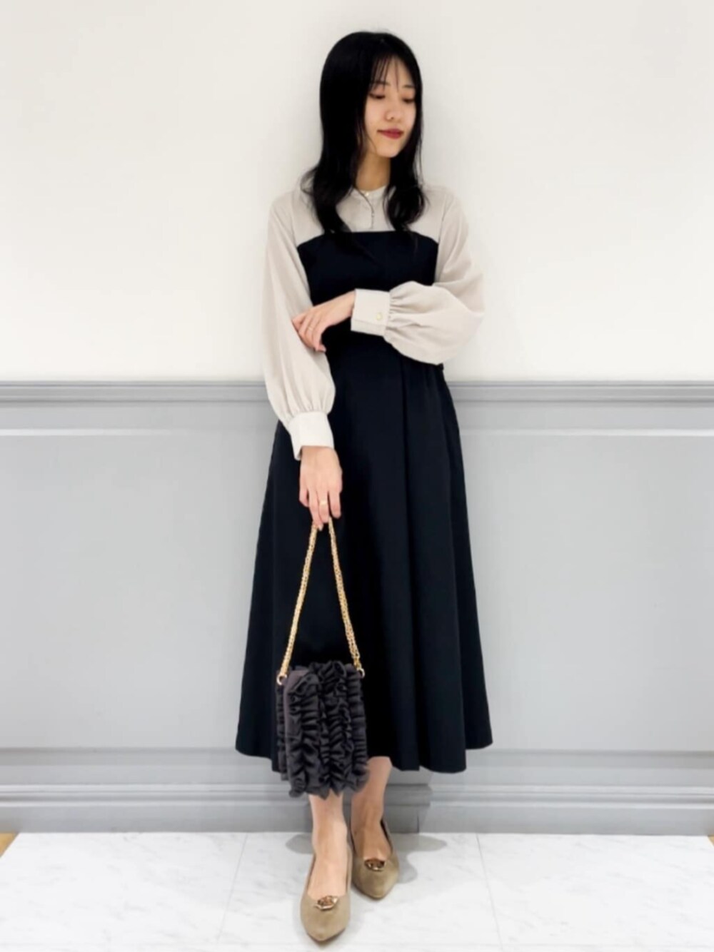 【ワンピース】 サイズ感:153cm Sサイズ着用。足首がしっかり見える丈感で、身幅やウエストは少しゆとりがありました。 素材感・着心地:シャツ部分は軽く柔らかさのある素材、ビスチェ部分はハリ感のあるスーツのような素材です。裏地はありませんが少し厚みのあるしっかりとした生地なので、個人的に透け感はあまり気になりませんでした。 おすすめポイント:こなれ感を演出できるドッキングデザインのワンピース。これ1枚でトレンドのスタイルが完成します◎ 【スタイリングポイント】 トレンドスタイルを上品に♡大人のワンピーススタイル