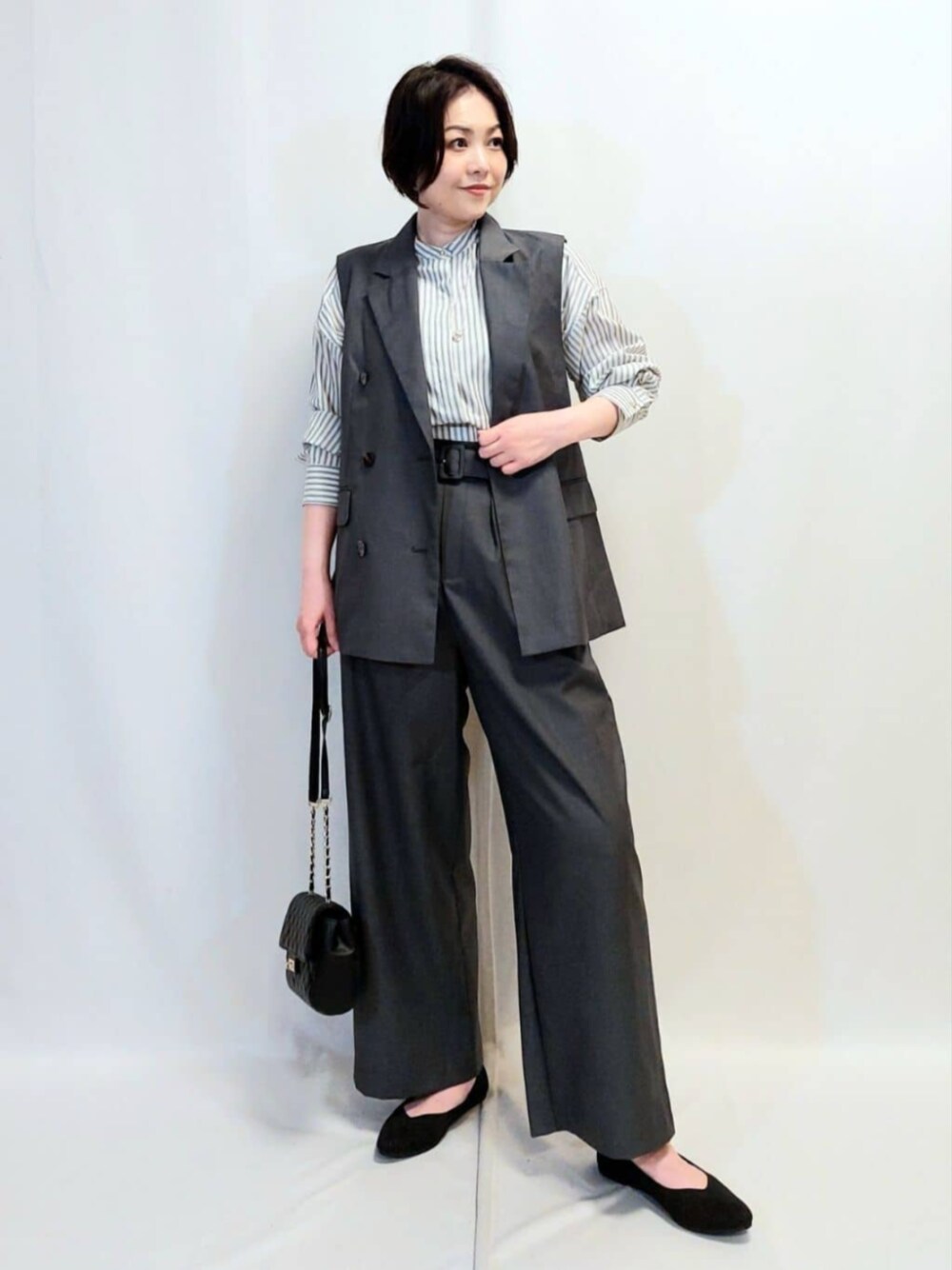 《スタイリングポイント》 テーラードジレをセットアップ風に。 ブルーのストライプシャツでクリーンな印象にしました。 《ジレ》 サイズ感:Mサイズ着用 どなたも楽にコーディネートできます。 素材感、着心地:高見えのきちんと素材です。重すぎないので着やすいです。 おすすめポイント:秋のマニッシュなスタイリングにおすすめです。スタイリングにワンポイント足りないな、という時に活躍します。 《ブラウス》 サイズ感:Mサイズ着用 ゆったりしていて、丈も長めです。 素材感、着心地:テロっとしすぎず、程よいとろみ感のあるシャツで、張り感とのバランスが◎です! おすすめポイント:羽織ものやジレなどのインナーや1枚着としても、とにかく1枚あるとコーディネートの幅が広がります! 《パンツ》 サイズ感:Mサイズ着用 ゴムが伸びにくいので、掃くときに少し腰が引っ掛かりました。腰の張りが気になる方は大きめサイズの方が着やすいかもしれません。 素材感、着心地:程よく厚みがあり、高見えします。 おすすめポイント:しっかりとした丈とボリュームがあり、マニッシュなスタイリングにぴったりです