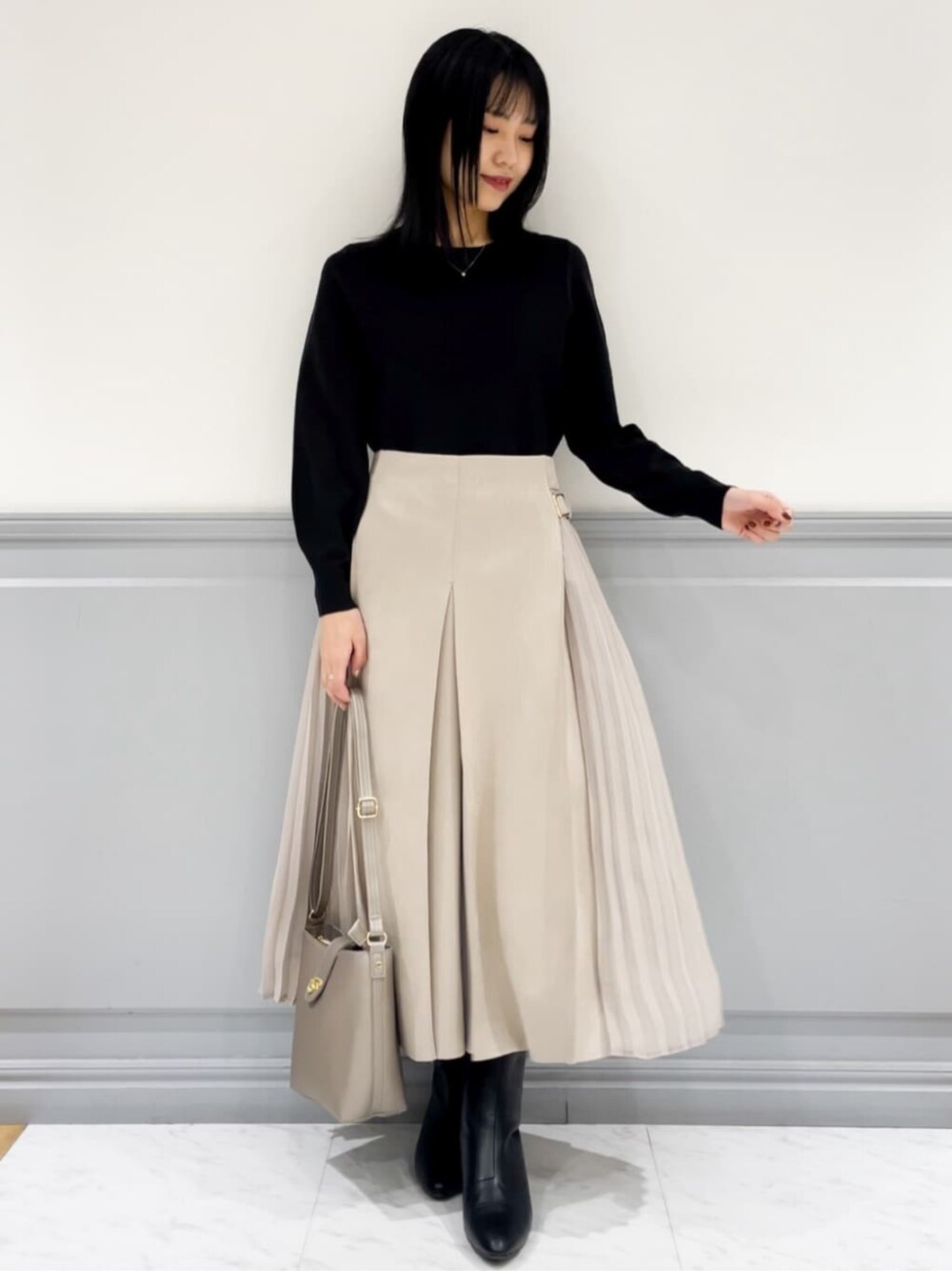【トップス】 サイズ感:153cm Sサイズ着用。腰回りが隠れる丈感で、全体的に少しゆとりがあります。 素材感・着心地:大人気の毛玉軽減シリーズニット。お家の洗濯機で洗えるのでお手入れも楽ちんです。 おすすめポイント:シンプルなデザインながら、程よくボリュームのあるスリーブデザインがお洒落♡コンパクト丈なので、どんなボトムスとも相性◎です! 【スカート】 サイズ感:153cm Mサイズ着用。足首が見える丈感で、ウエストはゆとりがありました。サイドのベルトで軽くウエスト調節ができるデザインです。 素材感・着心地:もっちり感のあるマシュマロタッチ素材。柔らかくて手触りも良く、後ろゴムなので着心地も◎ おすすめポイント:歩くと揺れるサイドプリーツがお洒落♡少し長めの丈感なので、オフィス使いにもオススメです。 【スタイリングポイント】 大人気の毛玉軽減シリーズのニットを使用した キレイめスカートスタイル
