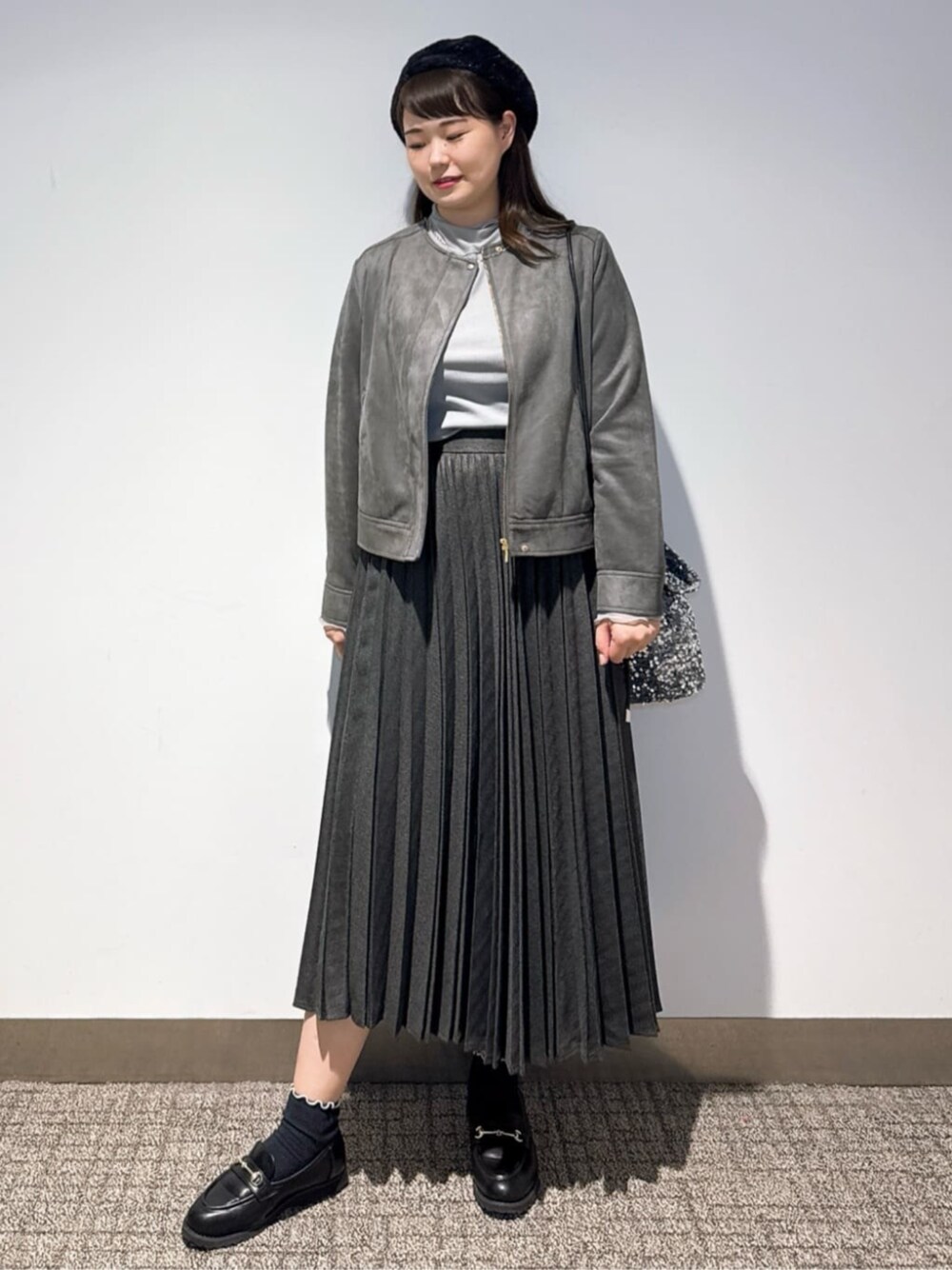 骨格ウェーブ 【サイズ感】 全てジャストサイズです。 【素材感・着心地】 ジャケットは柔らかい素材感です。 スカートはウエストがゴムなので着用しやすいです。 【おすすめポイント】 バッグをキラキラしたスパンコールのものにして華やかな雰囲気にしいます。 【スタイリングポイント】 モノトーンをイメージしてコーディネートしてみました。