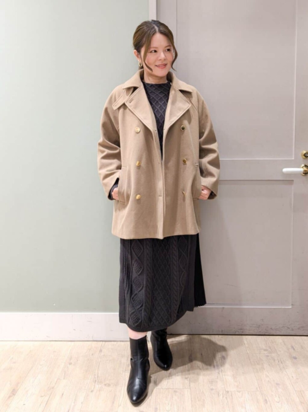 【スタイリングポイント】 上品カジュアルな大人のワンピーススタイリング ●コート 【サイズ感】 Mサイズ着用 全体的にゆとりあり。 お尻が隠れる着丈でアームにも余裕があります。 ボタンを全部閉めても窮屈感はないです。 【着心地•素材感】 羽織ってみるとそこまで重さは感じず着られました。 メルトン調素材が柔らかくて肌触りが良いです。 【おすすめポイント】 ラグランになっているのでカッチリしすぎず、普段使いしやすいです。 ゴールドボタンが3つ付いていて縦ラインができ、華やかにさり気なくスタイルアップしてくれます。 ●ワンピース 【サイズ感】 Mサイズ着用 ジャストサイズでした。 着丈は長めで安心です。 【着心地•素材感】 サイドのプリーツ切替があることで足さばきが良く、楽ちんな着心地です。 透けにくいですが、裏地は無いのでペチコートがあるとより安心して着ていただけます。 【おすすめポイント】 サイドのゴールドボタンやフロント部分の編み地の変化など、1枚で着映えするアイテム♪ 体型カバー&時短できるワンピースです。
