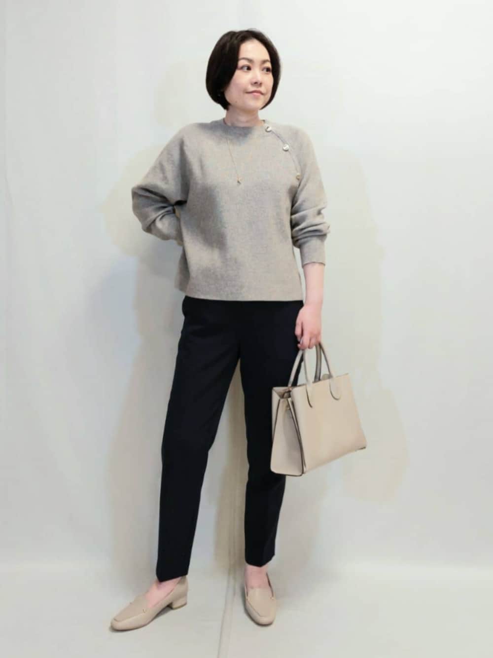 《スタイリングポイント》 スッキリシルエットのパンツと、ボタン使いがワンポイントになるニットのお仕事におすすめのスタイリングです。 《トップス》 サイズ感:Lサイズ着用 少し丈が欲しかったのでLサイズ着用しています。 スッキリ合わせたい方はMの方が良さそうです。 素材感、着心地:しっかり厚みがあります。やや光沢感も感じる、きちんと見えするニットです。 おすすめポイント:裾がフラットなので、腰周りがスッキリ見えます。ボトムスを選ばずに合わせらるのもポイント! 《パンツ》 サイズ感:Mサイズ着用 他のgroveのテーパードパンツと比べると、丈はほんの少し長めのタイプかなと思います。 素材感、着心地:しっかりと張り感がありながら、しなやかで履き心地がとにかく良いです! おすすめポイント:スッキリ、きちんと見えしつつ、履き心地は抜群の楽チンパンツです。 お仕事にも、ハレの日にもおすすめです。