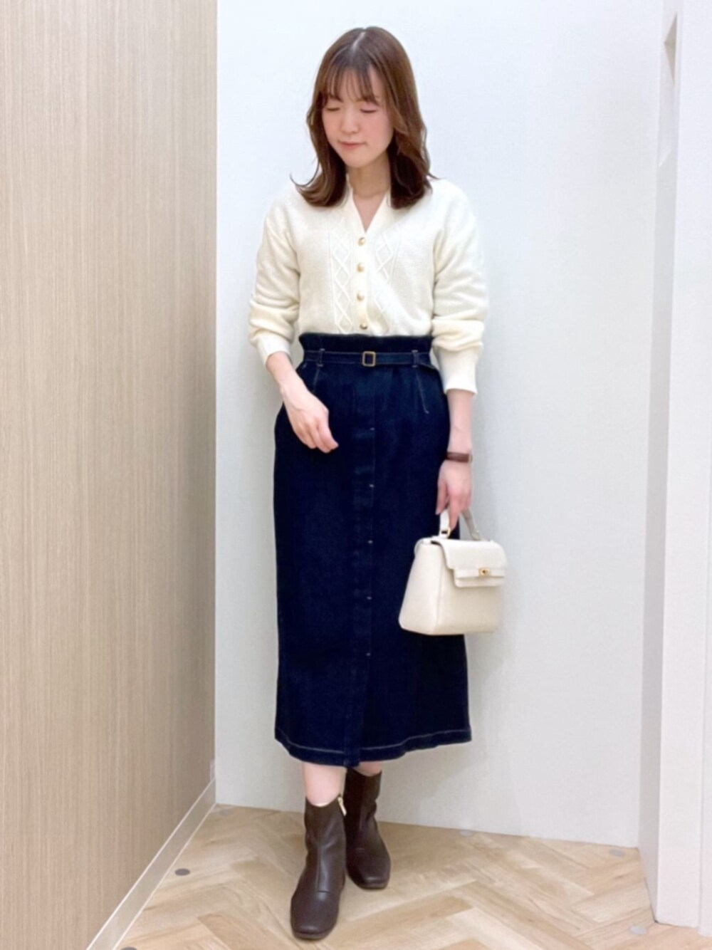 【サイズ感】 ◇ニット Sサイズ 着丈短めでコンパクトなサイズ感です。 首元はギリギリインナーが見えないぐらいの 開き具合です。 ◇スカート Mサイズ ウエストはゆったりしているので ベルトをしっかり閉めて履いています。 【素材感・着心地】 ◇ニット モチモチした柔らかいニットで着心地◎ 程よい厚みで今から春先まで着れる素材です。 ◇スカート 柔らかいデニム素材。 タイト過ぎず足捌きも◎ 【おすすめポイント】 セットアップのスカートはベルト付きで 単品で着てもかわいいです♪ ニットはカーディガンとしても着れて 着回し力◎です! 【スタイリングコメント】 スタイルアップして見えるように スカートをハイウエストではいてます! Vネックで首元に抜け感を出したのもポイントです♪