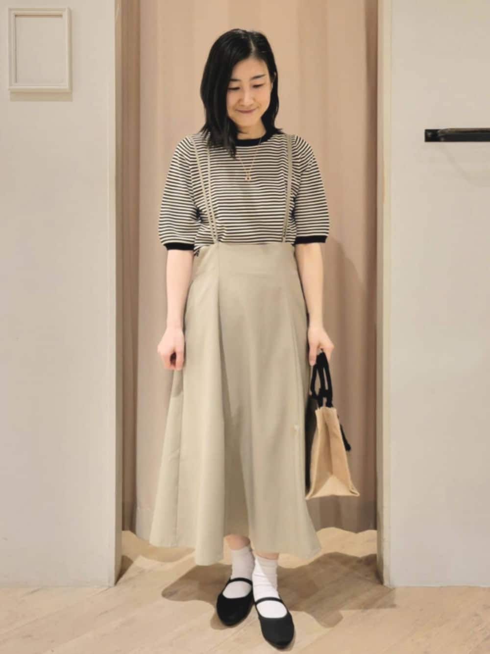 春夏コーディネート 【素材感 着心地】 《トップス》 もちっとした素材で着心地も良いです。 《スカート》 薄くて軽い素材です。 【サイズ感】 《トップス》 袖が五分袖で二の腕をカバーしてくれます。 《スカート》 ウエストは、ひもで支えているくらいゆるめでゆとりがあります。 後ろのアジャスターで丈の調節可能です。(4枚目) 【おすすめポイント】 《トップス》 洗濯機OK、毛玉軽減、接触冷感、UVカットと4つの機能が嬉しいトップスです。 《スカート》 広がらず、落ち感のあるシルエットです。 きれいめにもカジュアルにも使えます。 【スタイリングポイント】 春から初夏まで使えるおでかけコーディネートです♪