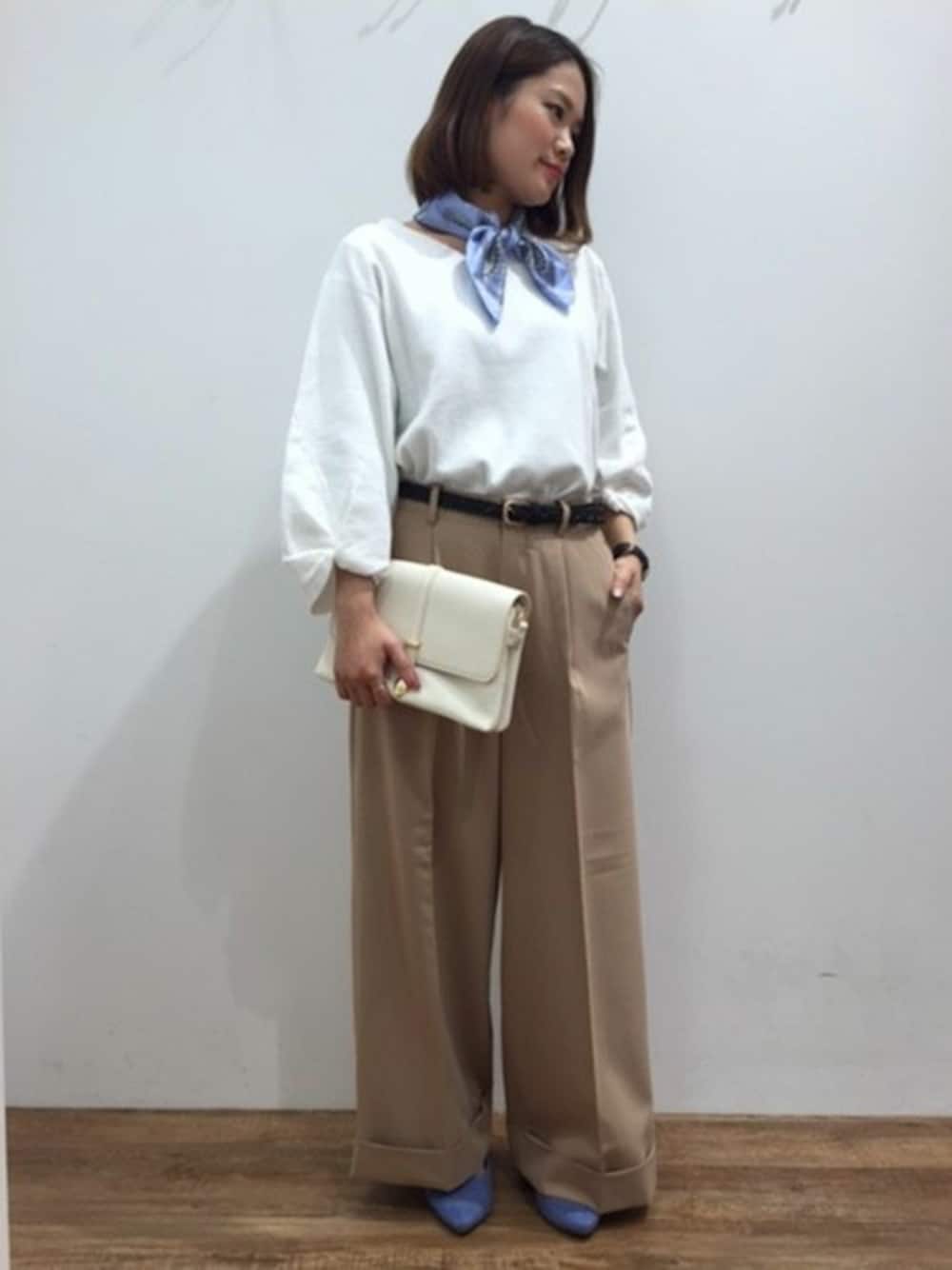 袖デザインのプローバーにさし色でスカーフと足元にブルーを合わせることで春らしく。