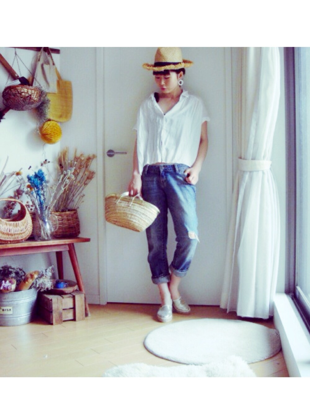バッテン印のダメージ加工がされてるshipsのデニム。 ゴールドのカゴバックとエスパドリュー。 シンプルなので、少し大振りのアクセサリー♡