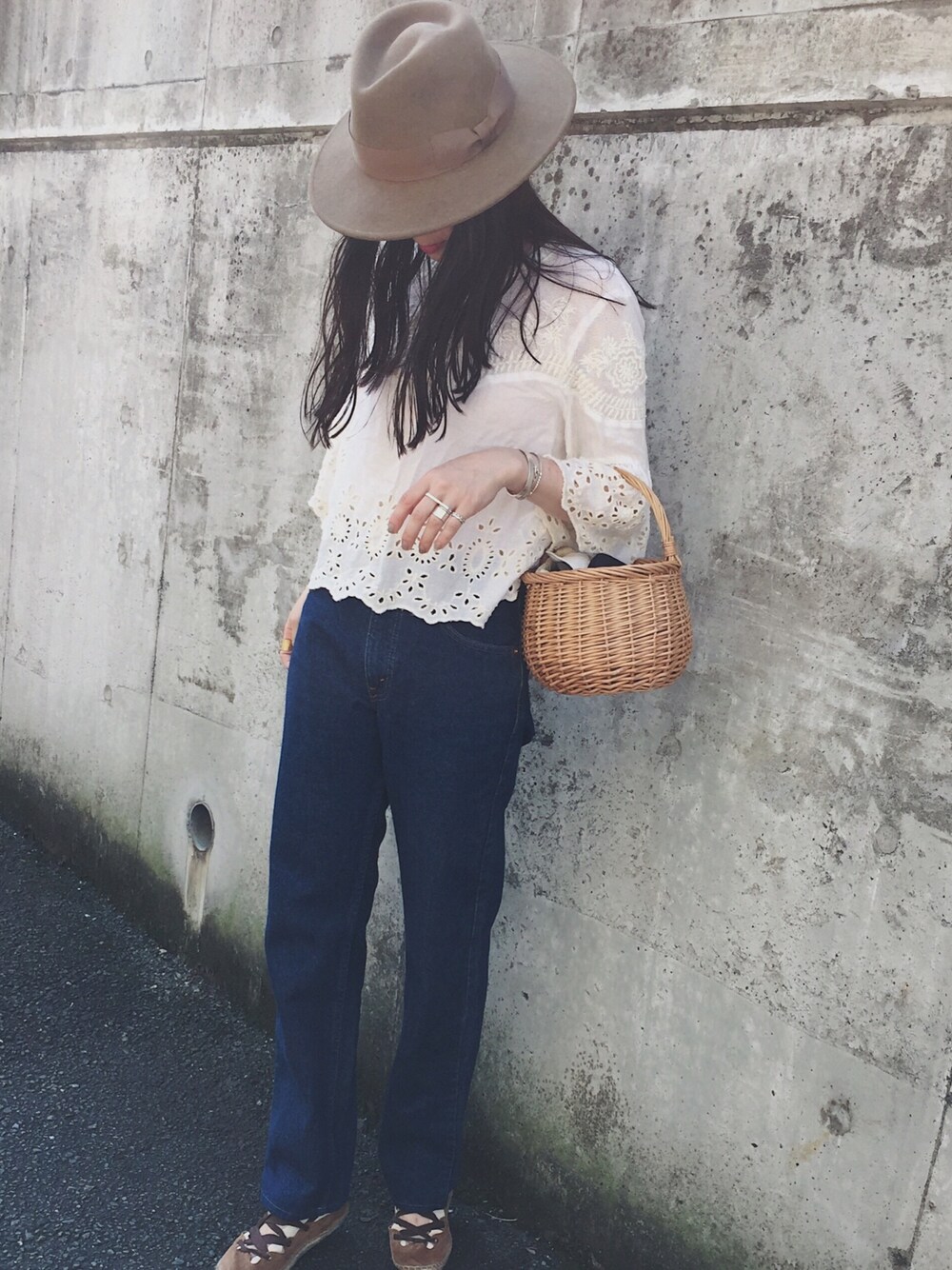 ブルー系のデニムパンツを着用したレディースの秋コーディネートの1枚目の写真