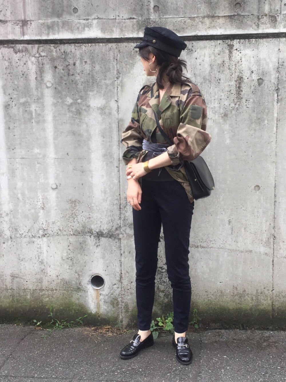 ブラック系のシューズ、ブラック系の帽子を着用したレディースの秋コーディネートの1枚目の写真