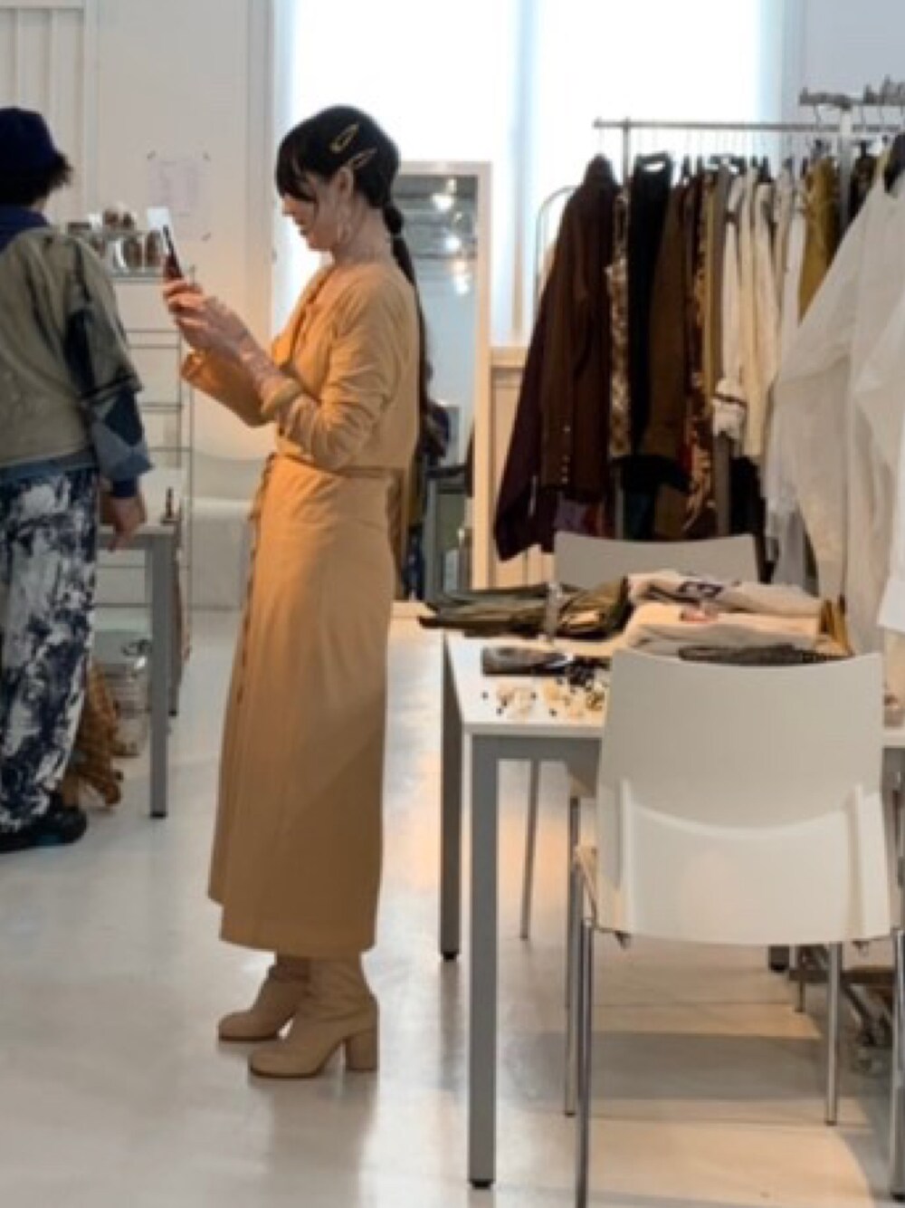 ベージュ系のワンピースを着用したレディースの秋コーディネートの1枚目の写真