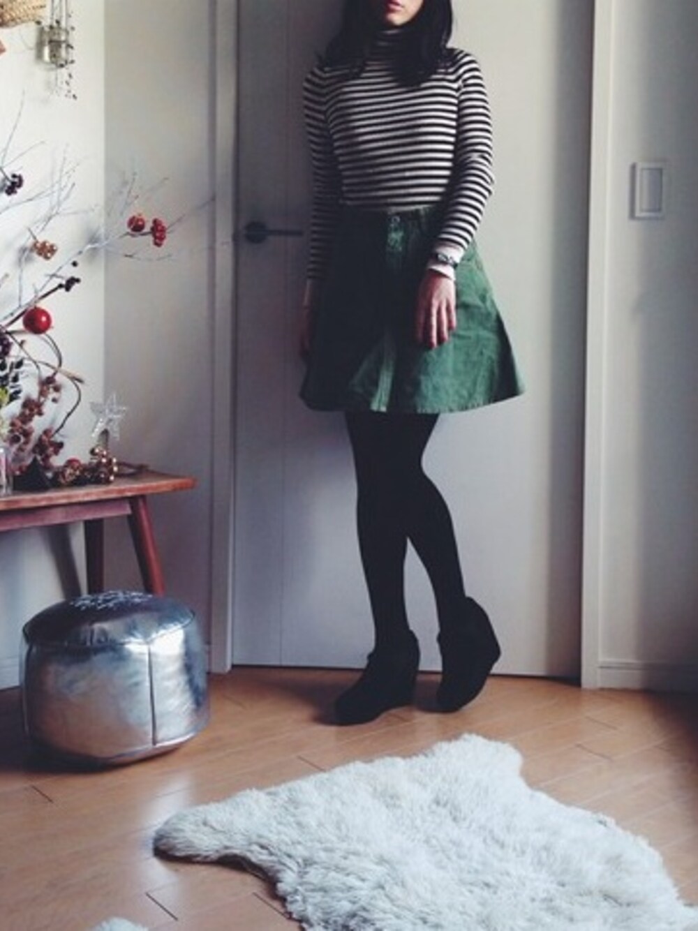 ボーダータートルをデニムフレアスカートにin。 プラス厚手タイツに厚底ブーティ。 素敵な店員さんの真似っこスタイルです。