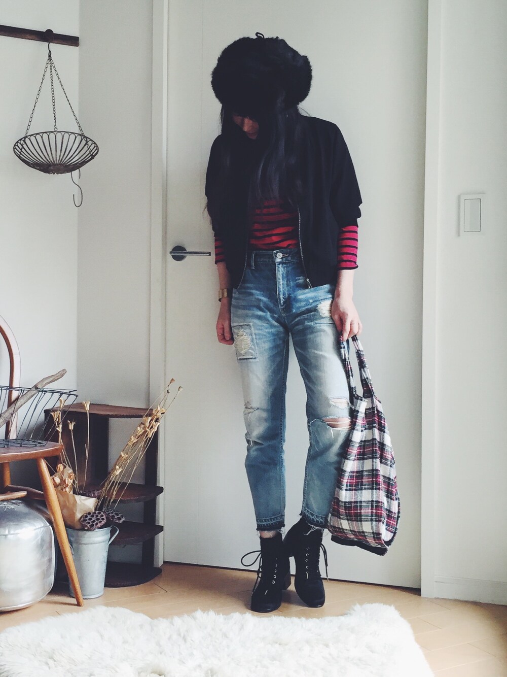 たまには色味を。 赤をポイントに。 そして何といっても一目惚れしたファーの帽子! instagram→r_grun