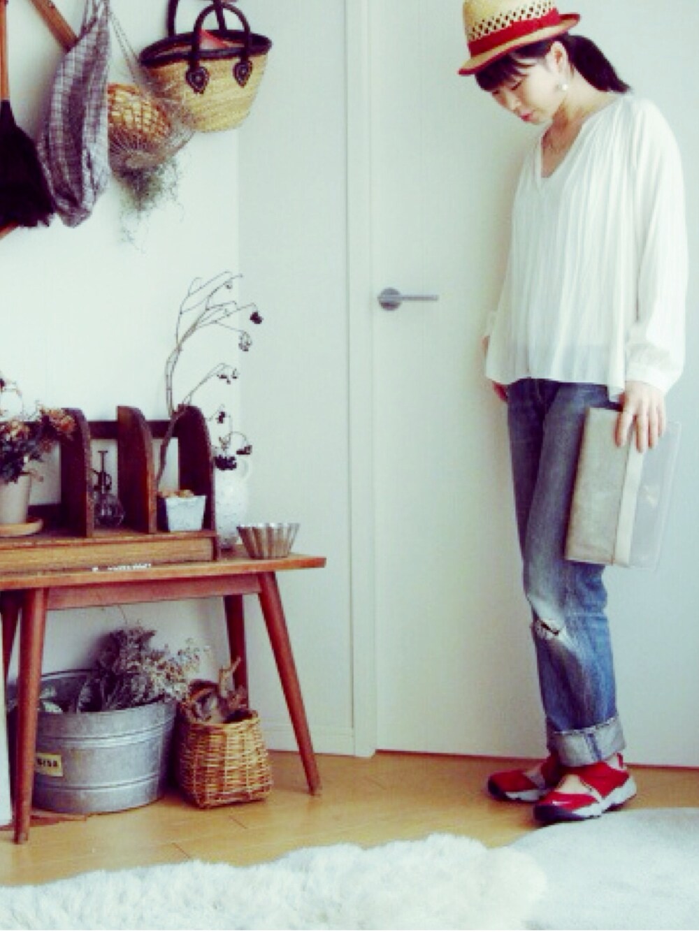デニム→journal standard 帽子→ships リラックスコーデに大振りアクセサリーでポイントを。