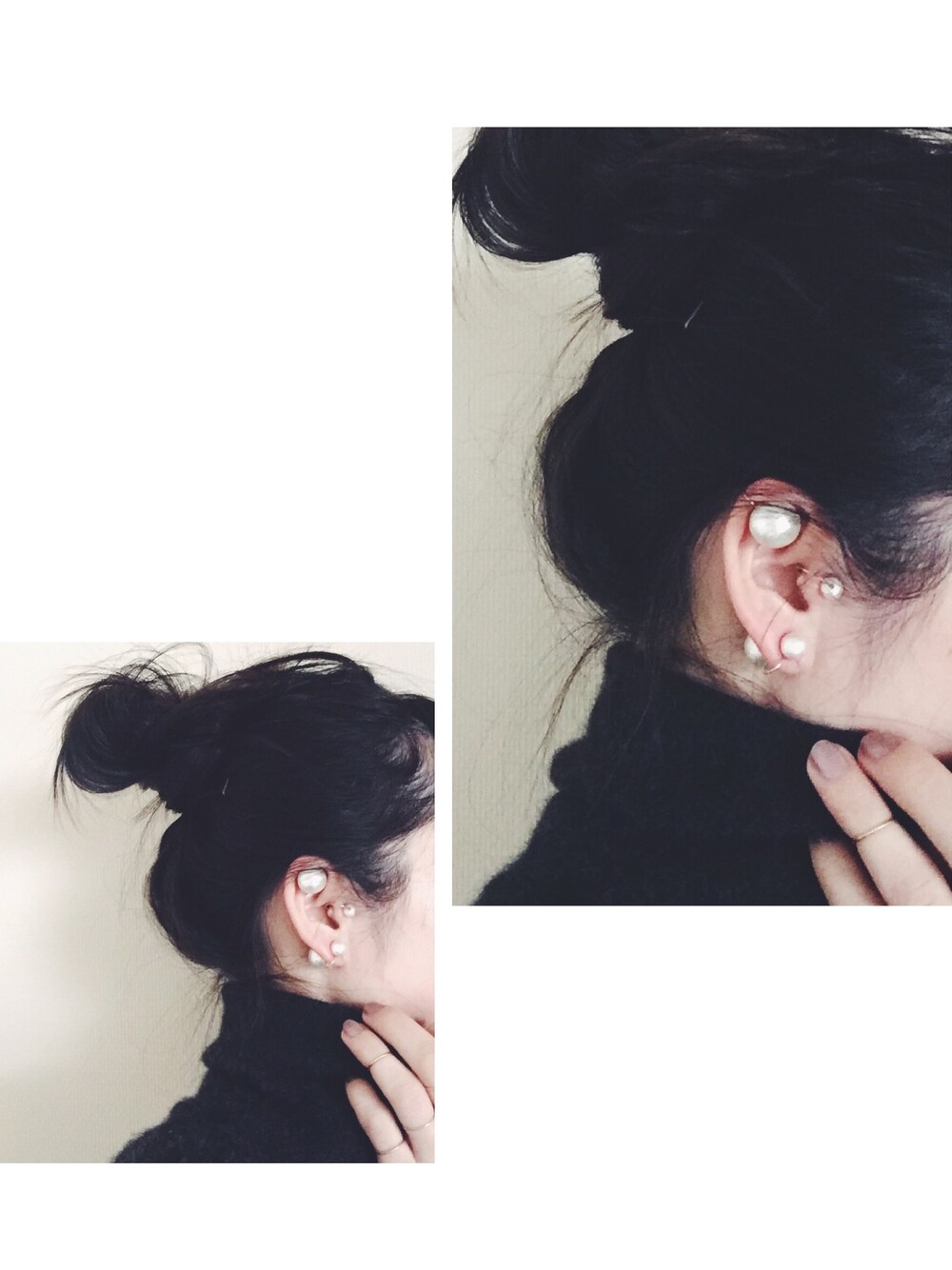 ホワイト系のイヤリングを着用したレディースの冬コーディネートの1枚目の写真