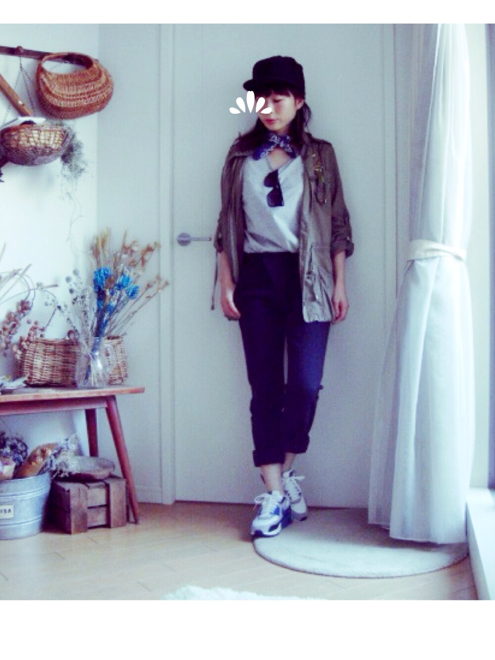 アーミーシャツ。日焼け対策。 首元には古着屋さんで購入したバンダナを巻いて。
