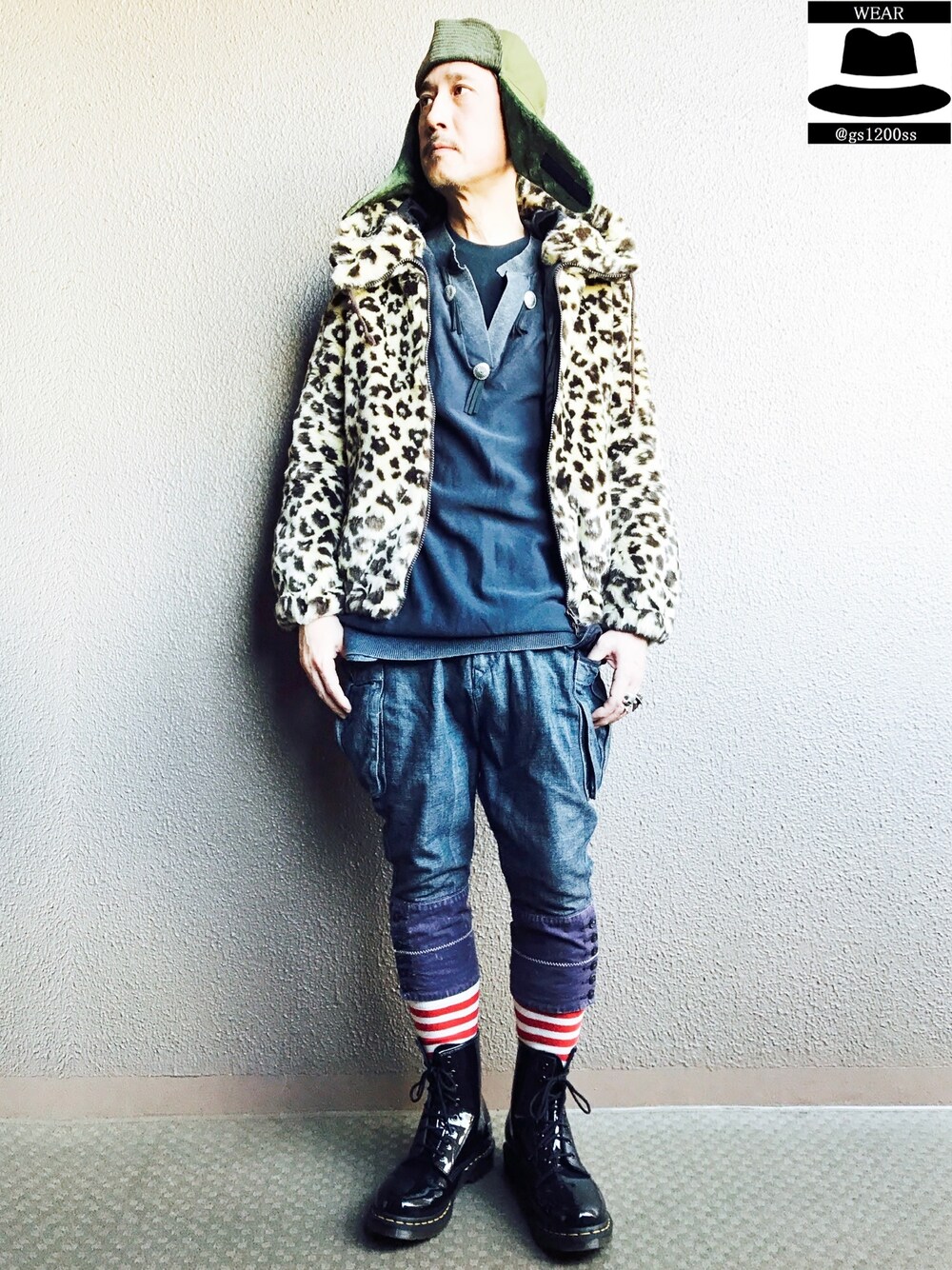 けもの大好きケモナーコーデ② フリースとフェイクファーの中間くらいの レオパ柄のモコモコのパーカジャケット。 硫化染のコンチョ釦スキッパースウェット グレーデニムのサルエルカーゴパンツ マーチン8ホールブーツなど