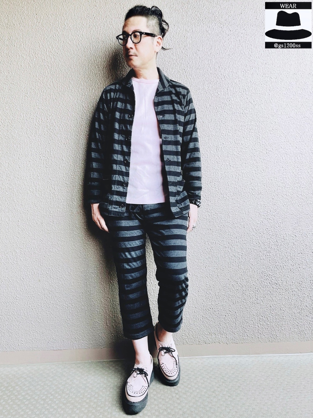 プリズナーストライプの グレピンセットアップコーデ カットソー地のボーダーの クロップドパンツ。 前に買ったこれと共生地の シャツカーデを見つけたんで購入。 上下セットアップで着ると 囚人感が増し増し? 寝間着っぽくならない様に モノトーン✖️ピンクの鉄板配色と かっちりしたラバーソールで ロックなテイストにまとめた。