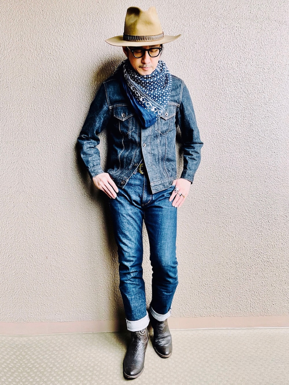 3rdタイプデニムジャケット💙🔷 1stとはまた違った趣きのある3rdタイプ ディティールがシンプルになった分 シャープでスマートなシルエットが持ち味 それを活かしてテーパードシルエットの ナローなジーパンとデニデニ合わせ まだ色落ちの進んでない濃いインディゴブルー 超大判のバンダナもブルー系でまとめて カウボーイハットと爪先のシャープな ウェスタンブーツで茶系を挿し色に。 アーバンカウボーイなアメカジコーデでした。