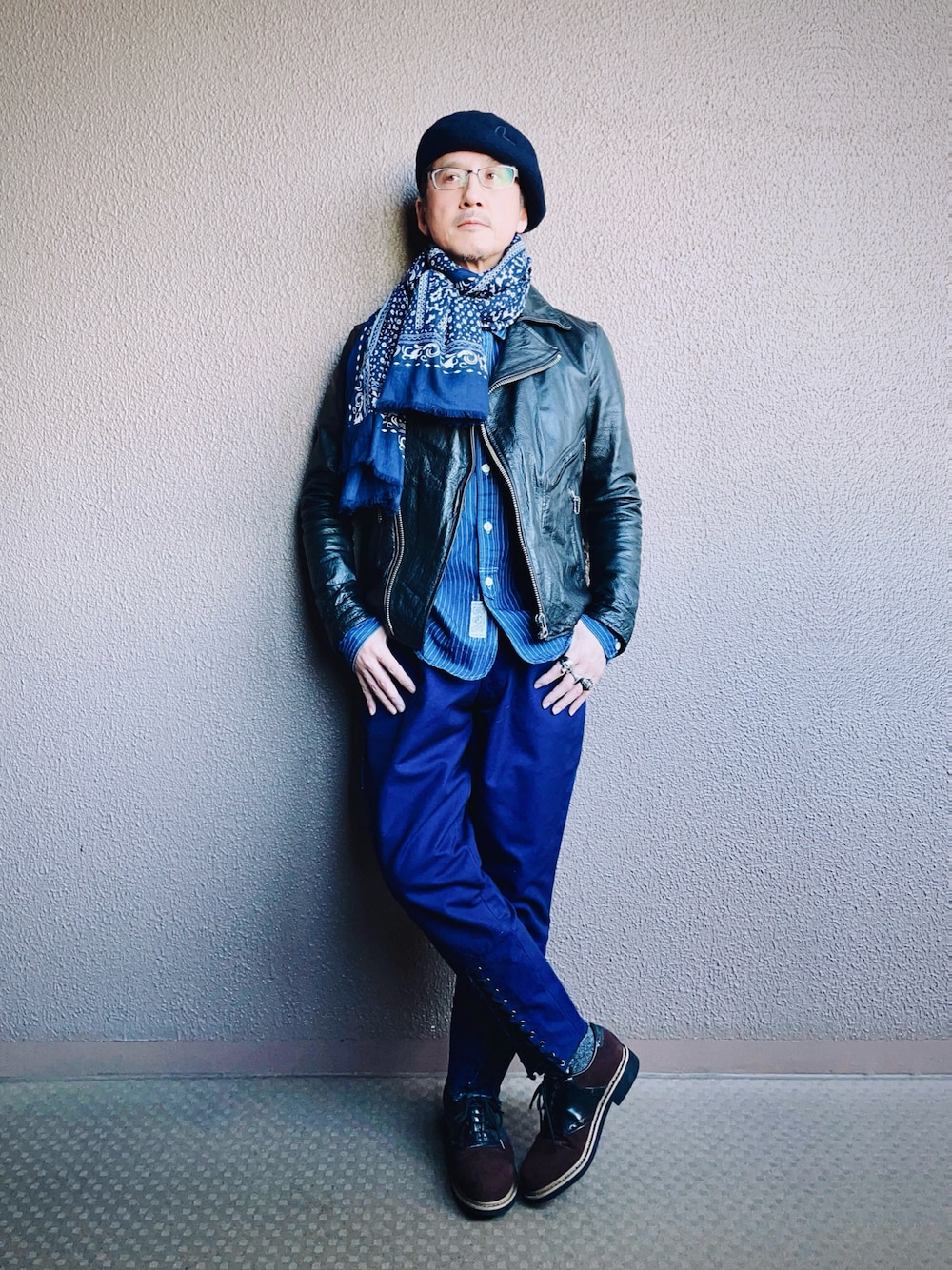 オールネイビー➕ブラックレザー⚓️👖♟️ バッファロー革のライダースジャケットに バンダナ柄のストール、ウールベレー ウォバッシュストライプのワークシャツ キャンパス地のブリーチーズ ネイビー〜ブルーにかけてのグラデに 黒光りするレザーを組み合わせる 大好きな配色パターンの一つ。 ちょいシックなライダースコーデでした。