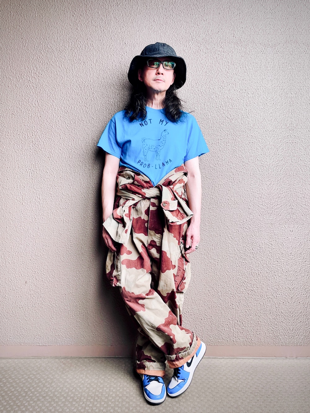 イタリア軍サンマルコ迷彩柄のつなぎ 迷彩柄の中でも特に好きな柄で 独特の色褪せ感に惚れ込んだ個体 Tシャツは古着で見つけた謎のラマ柄T 何となく気になって買った物で 「マヌケ美」に溢れる一品 茶系と水色も好きな配色で カラーリングに拘ったコーデでした。
