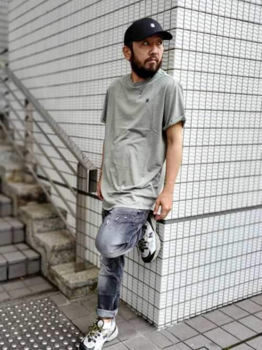 Tシャツ+デニムのシンプルコーデ。 キャップとスニーカーでアクセントを+。