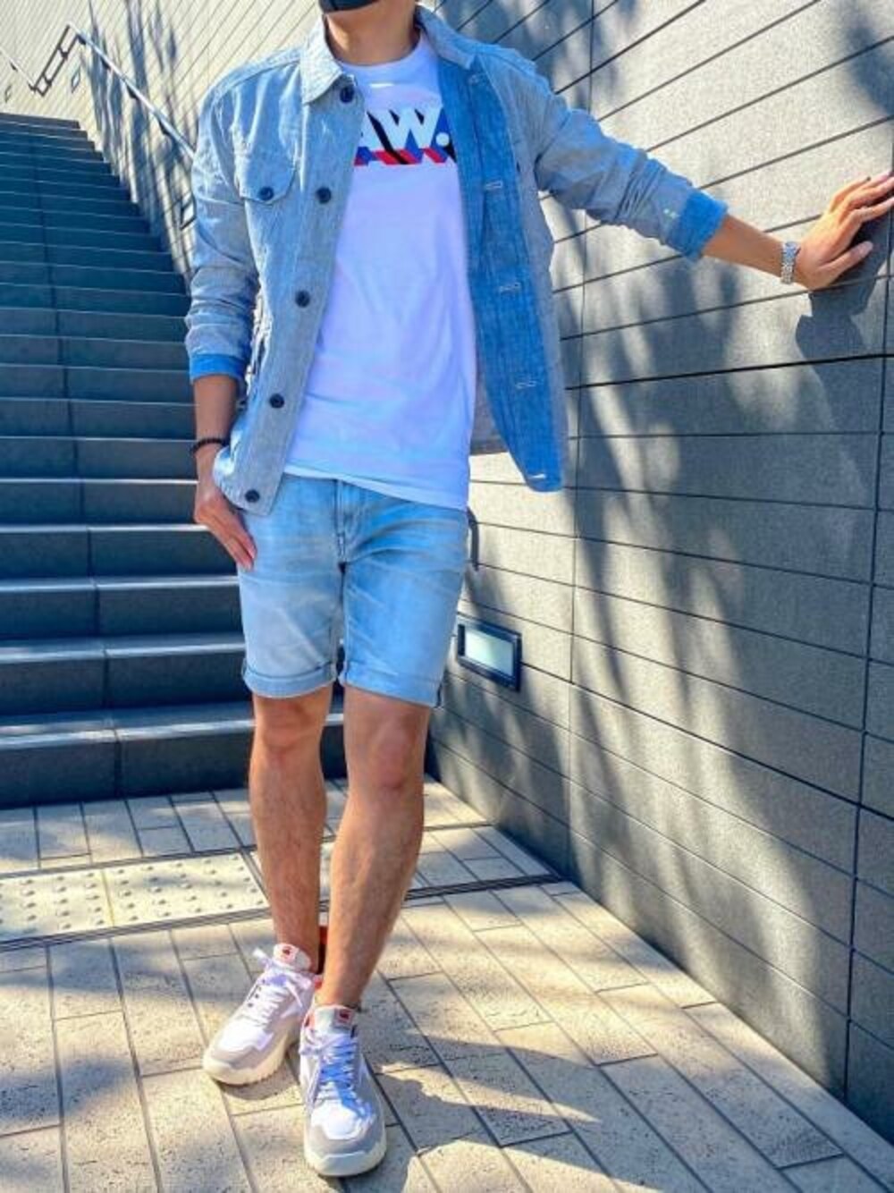 なんと言ってもこのシャツジャケット、よく見るとフロントは細かいストライプで、バックはチェック柄で切り替えてあります。 そして袖、襟裏、ジャケットの内側は薄いインディゴになっているのが特徴的で、よくよく見ると細かい部分がめちゃくちゃおしゃれです。 インナーは爽やかに白T、ボトムスはブルーグレーのdenimショーツで。