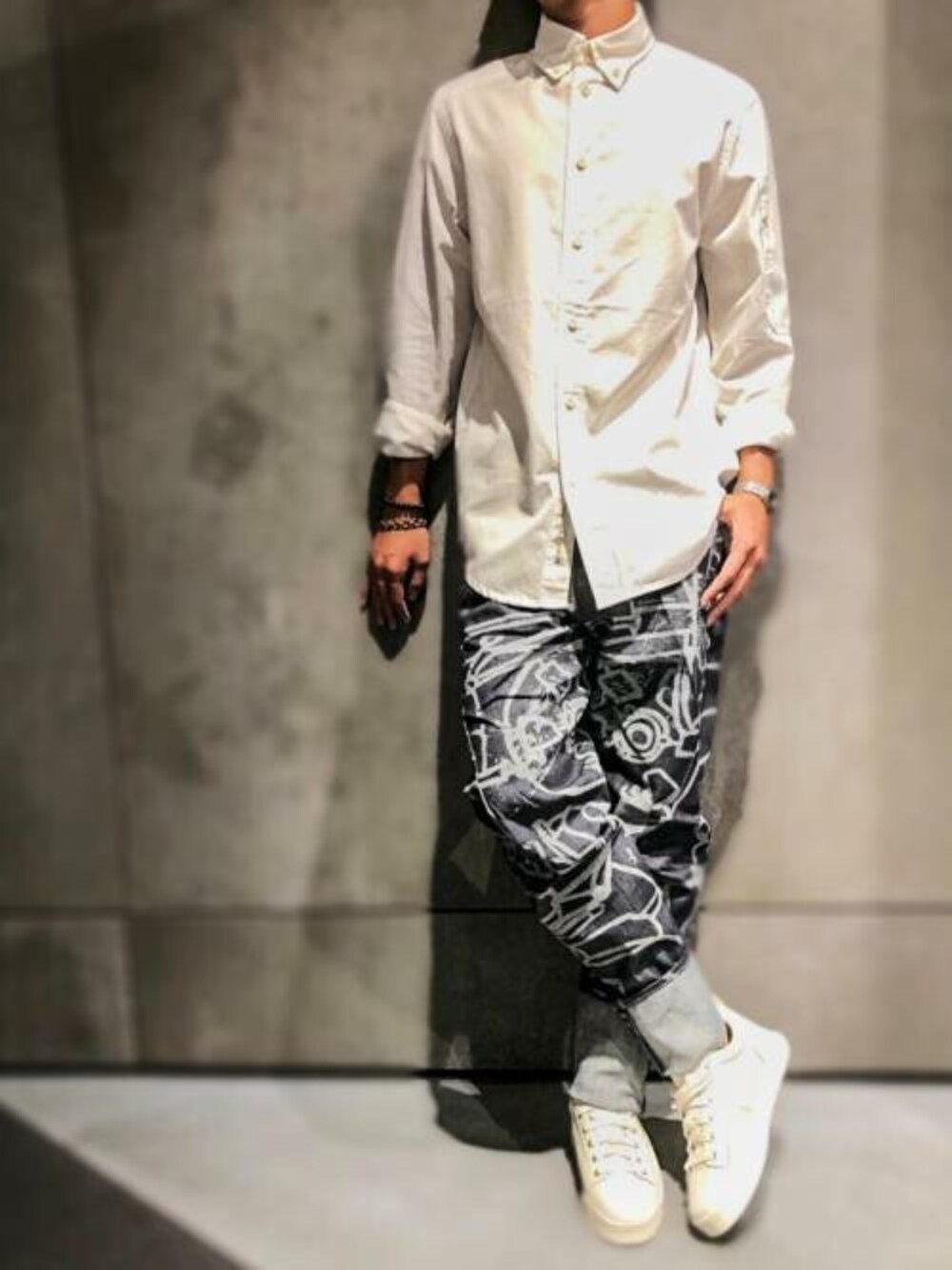今季一押しScutar!!! 今回は柄バージョンのご紹介です。 インパクトあるアートプリント。 RawDenimの上からグラフィック柄が施されています‼️ シルエットは立体裁断のスリムテーパードでストレッチも効いています!!! 今回はシンプルにシャツを合わせましたが、涼しくなったらパーカーやスウェットを合わせてカジュアル感を出してもいいですね!