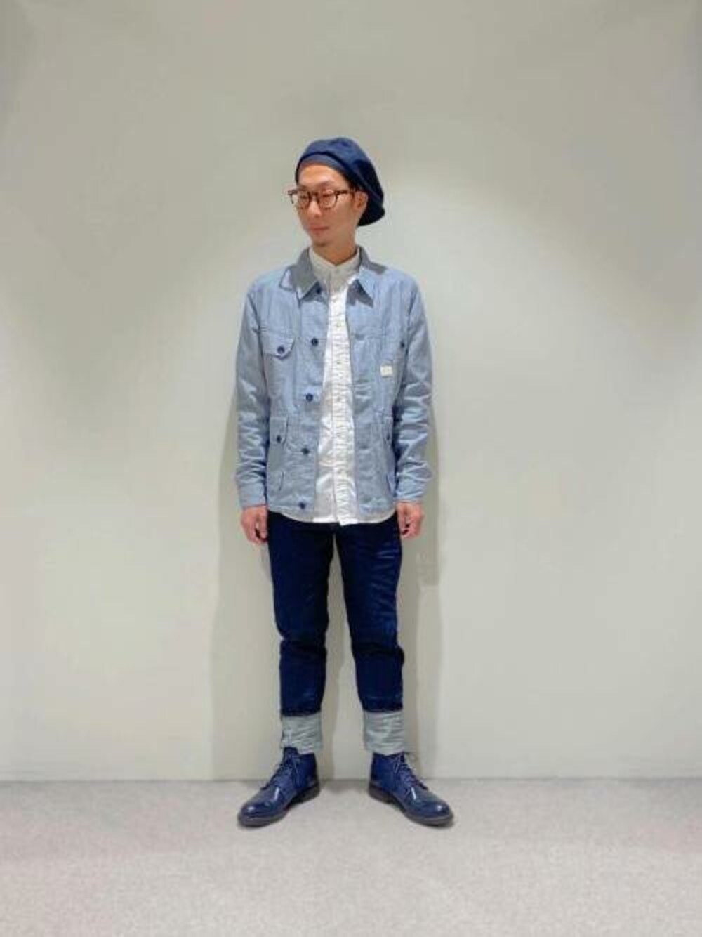 今期一押しのジーンズ、Scutarを使ったコーデ。 薄手のシャツジャケットとシャツを合わせてきれい目カジュアルに。