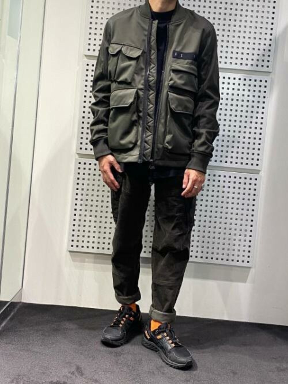 ソフトシェルの新作ジャケットを使ったワントーンコーデ。 足元にオリーブグリーンと相性の良いオレンジを差し色に。