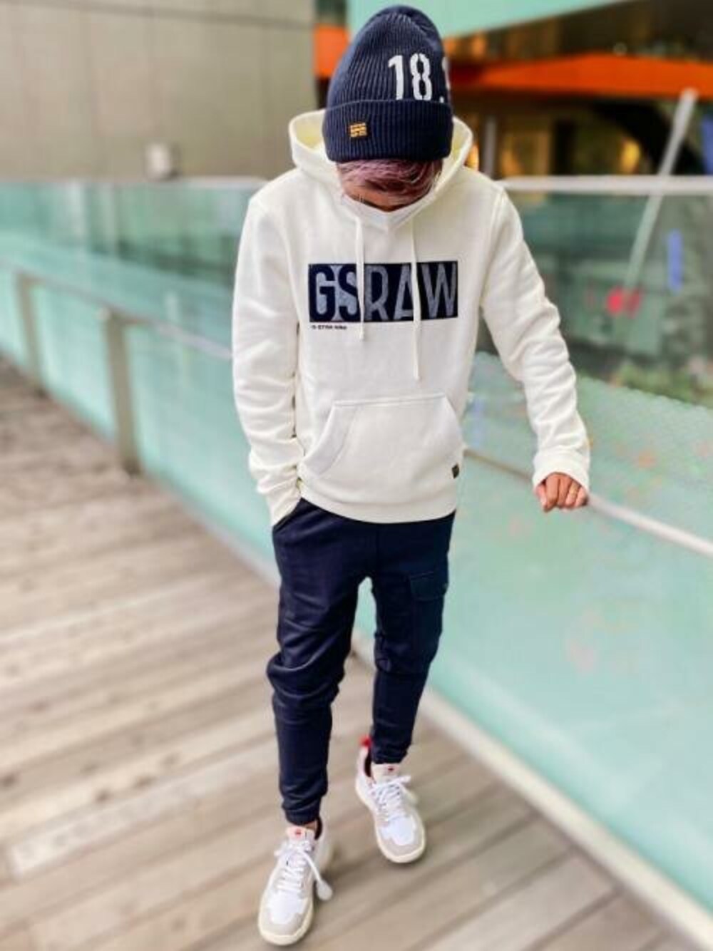本日は新作スウェットのご紹介です。 ネイビーのブランドロゴがインパクトある、ミルクカラーのスウェットは、フードがしっかりしてて崩れにくいです。 アップリケ部分はベロア素材になっています。 スウェットパンツはG-Starらしく膝が立体的になっていて、サイドにはヘリンボーンのラインがあり、斜めポケットとは別に、フロントとバックにポケット付き。 機能性も抜群です。 秋冬はおしゃれスウェットコーデを楽しみましょう!!!
