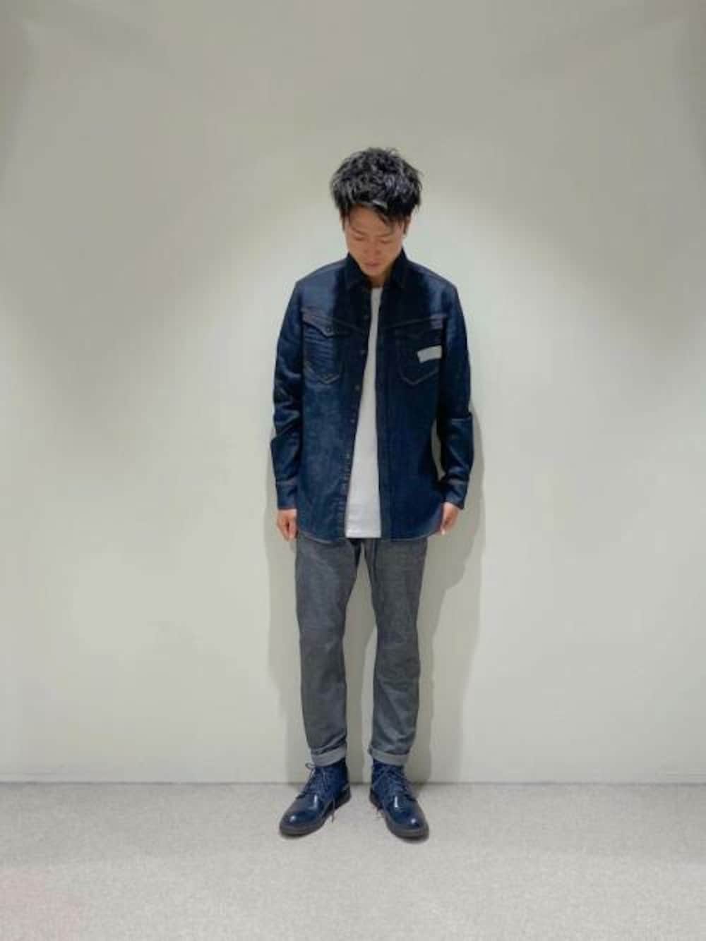 デニムシャツにグレーのチノパンツできれいめカジュアルに。