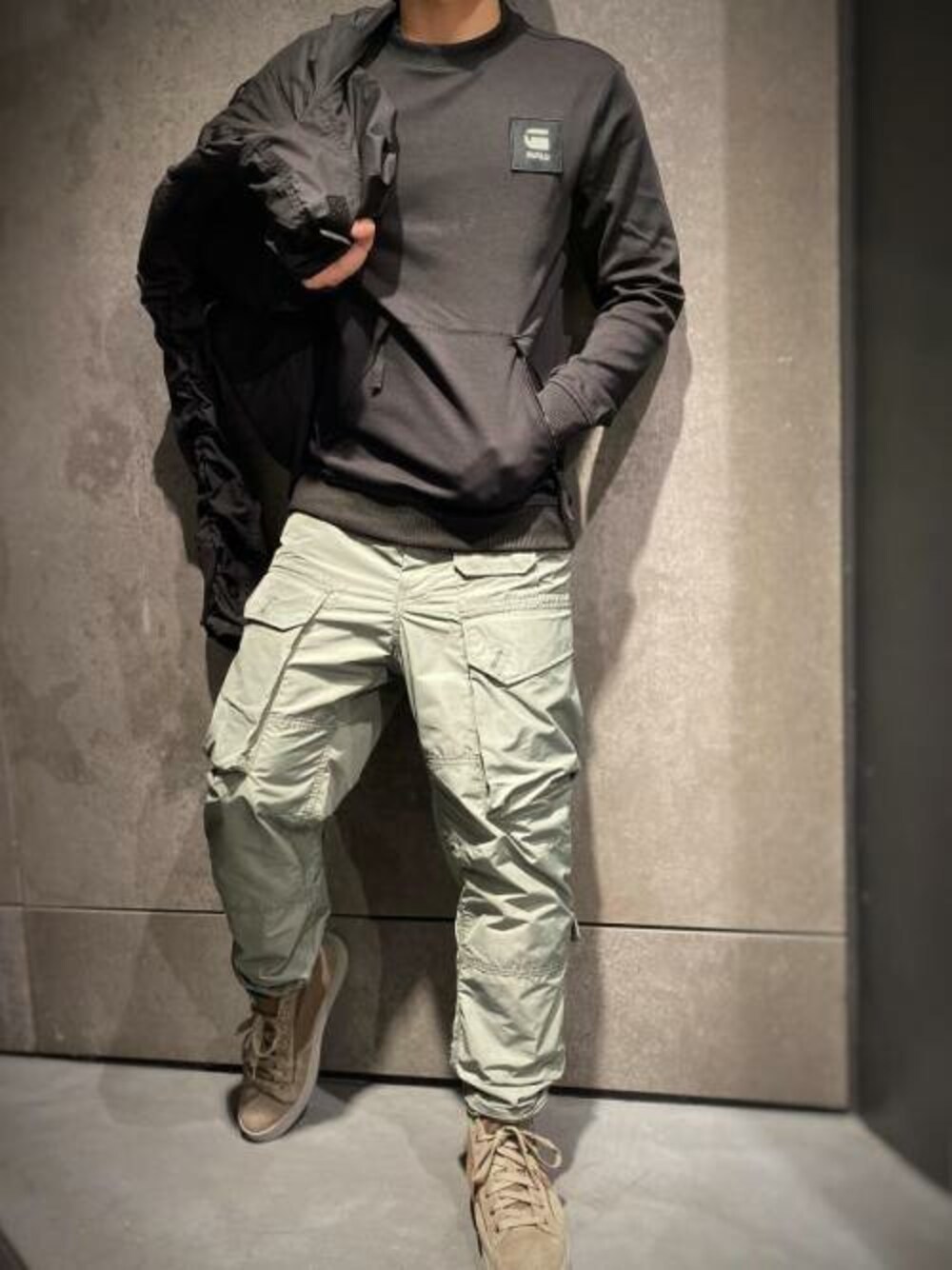 新作のカーゴパンツを使ったコーディネート。 新作のカーゴパンツは、ルーズスタイルなリラックスカーゴです。 グリーンとグレーが混ざった絶妙カラーが目を引きます。 裾はスナップボタンで調節出来ロールアップで足首を見せて穿いても、カッコイイです。 相性の良いブラックのトップスは、スウェットとロンTを合わせたようなしっかりした生地で、肌触り抜群です‼️