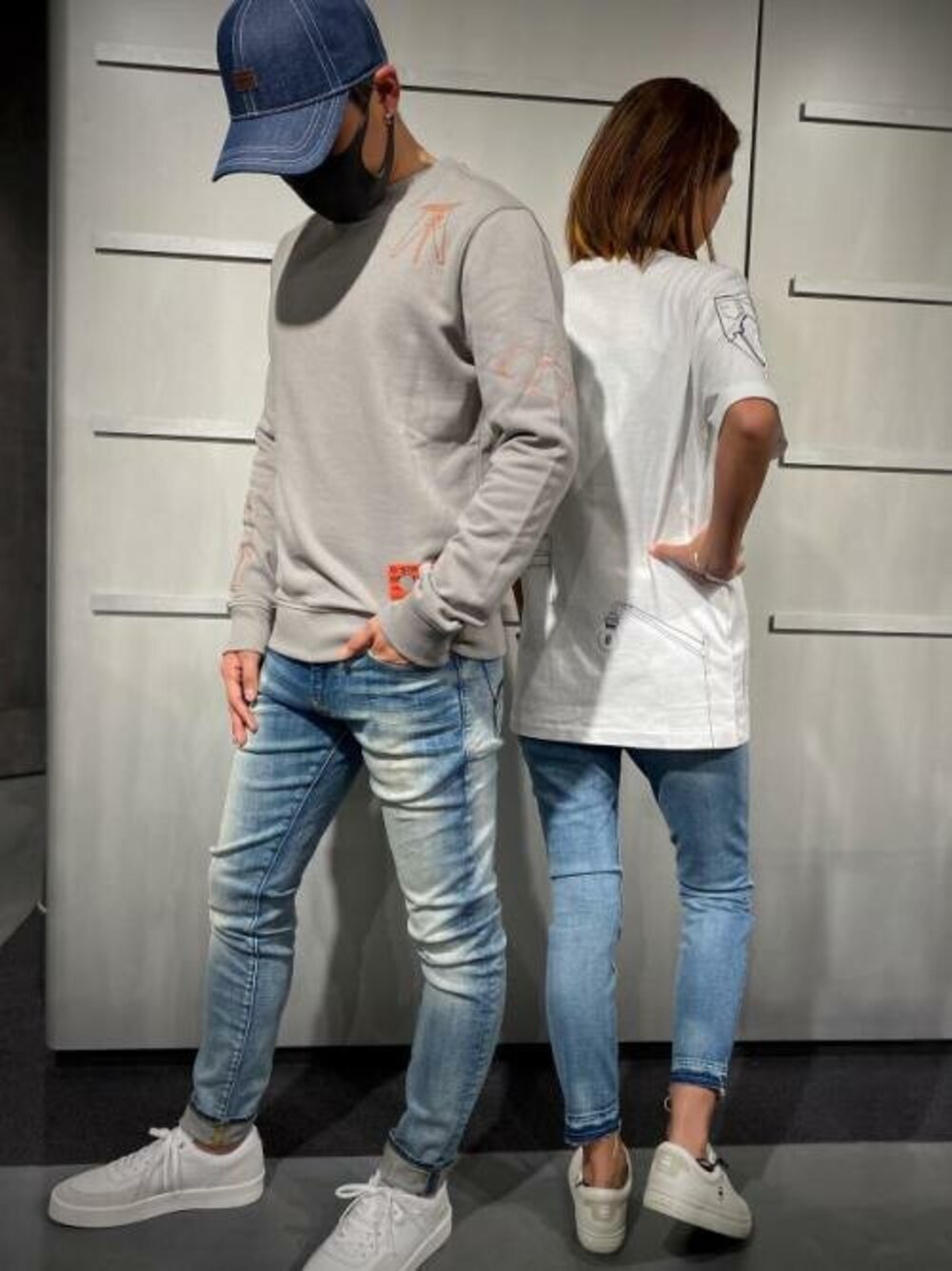 オブジェクト柄を使った新作スウェットとTeeを使ったコーディネート。 スウェットタイプは、オレンジのグラフィックプリントが目を引きます!!! フロントやバッグに刺繍が散りばめられているのが特徴で、ソフトな肌触りです。. 女性スタッフが着てるTシャツは、肉厚感ありしっかりした生地感です!!! 女性が着用するとヒップラインが隠れる長さで安心感があります。