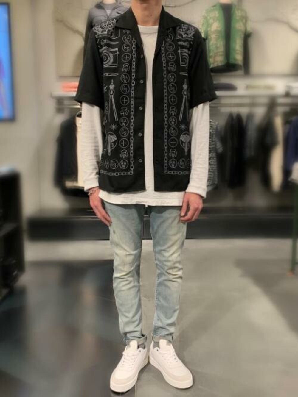 キレイなドレープ感が特徴の薄手のハイクオリティファブリックなハワイアンシャツを使ったコーディネート。 フロントには今期オリジナルのグラフィックプリントが施されておりインパクト抜群です。 ジーンズは新色の『D-STAQ』でダメージとホワイトペイントがさりげなく施されてるカッコいいアイテムとなっております!