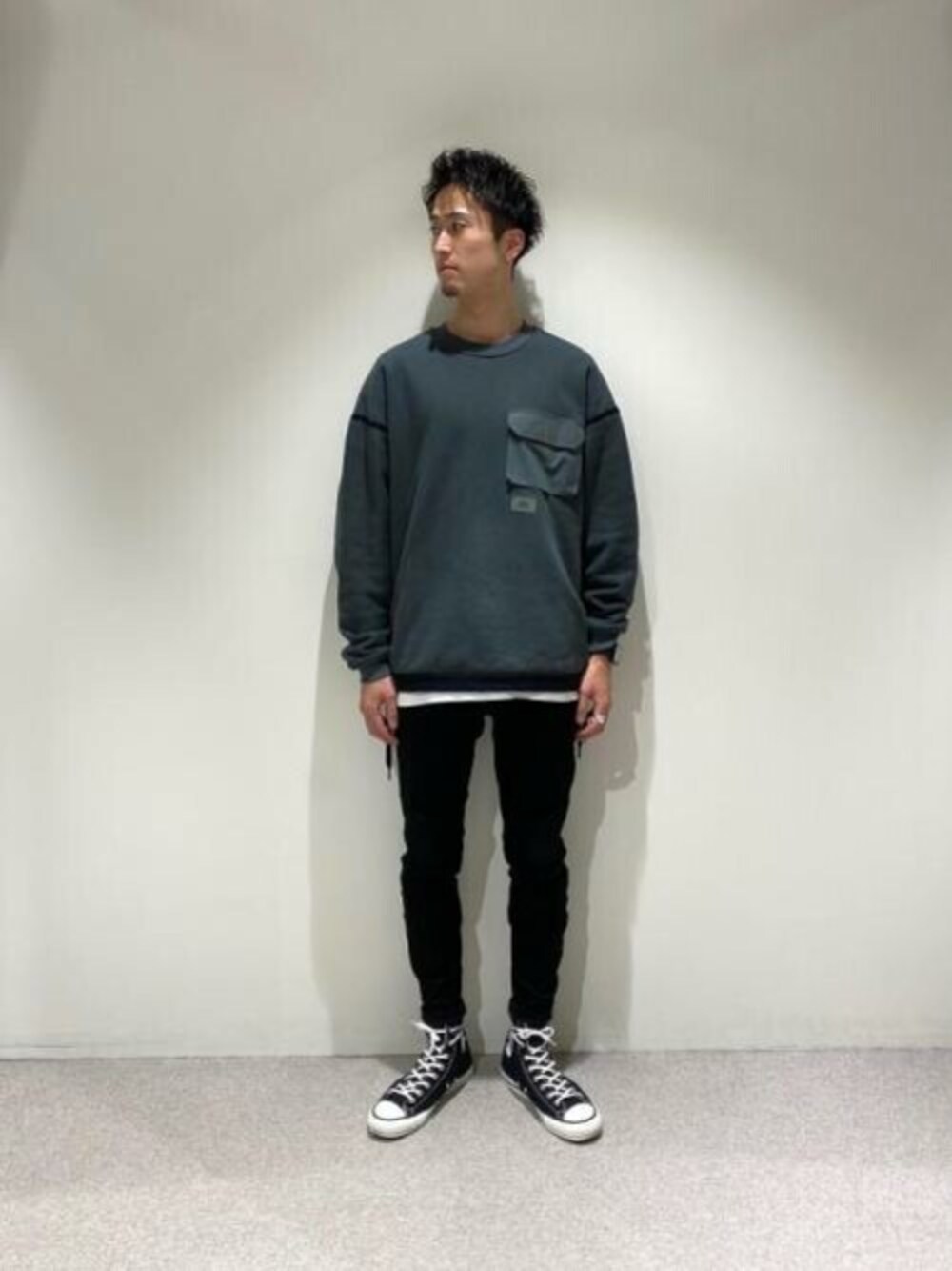 特徴的な素材感のスウェットと今期一押しのスウェットジーンズを使ったコーディネート。