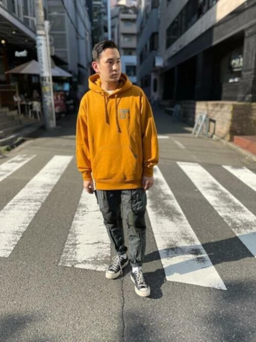 エクスクルーシブのカーゴパンツでコーディネートを組んでみたのでご紹介します! カーゴパンツは、デザインがかなり凝っており、裾幅も調節可能で写真では絞って穿いております! トップスには肩の落ち方が綺麗で背中のグラフィックもカッコいい!今季オススメのパーカーを合わせました!