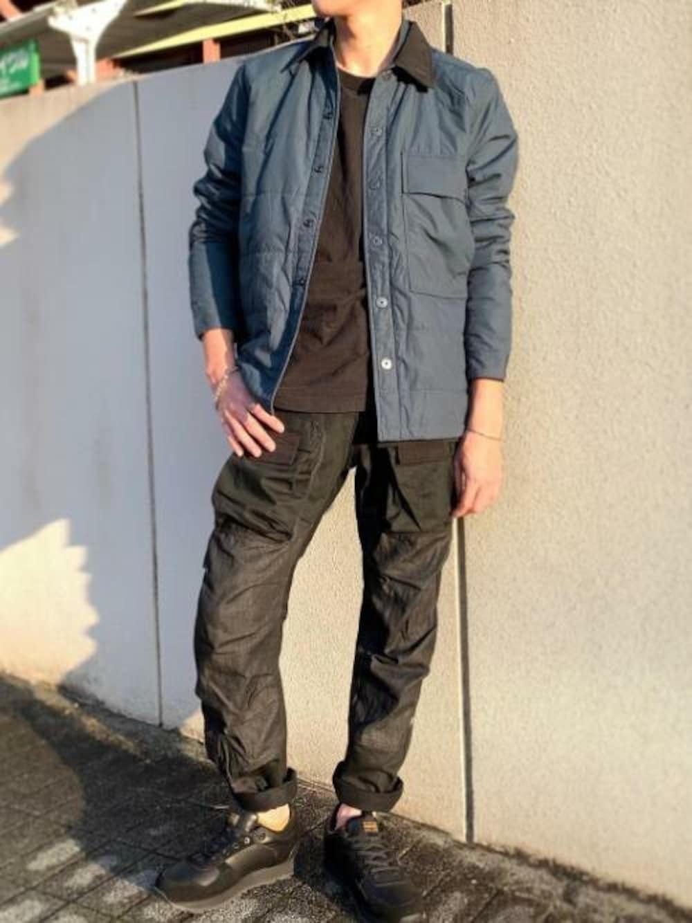 新作オーバーシャツを使ったコーディネート。 格子状のキルティングステッチを施した中綿入りオーバーシャツ! 袖口を調節できるスナップボタンや襟の内側にリブジャージを使ったハイネックデザインで首元も暖かに◎