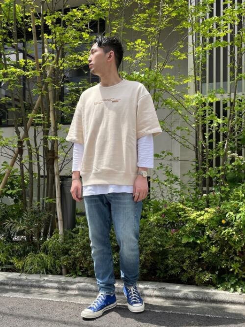 新作デニムを使ったコーディネートです! 春夏に活躍するライトカラーデニムで トップスにも明るめのアイテムを持ってきて爽やかな雰囲気にまとめました! 太もも周りは緩く裾幅までテーパードがかなり効いているので、 シルエットもよく使いやすい1本です!