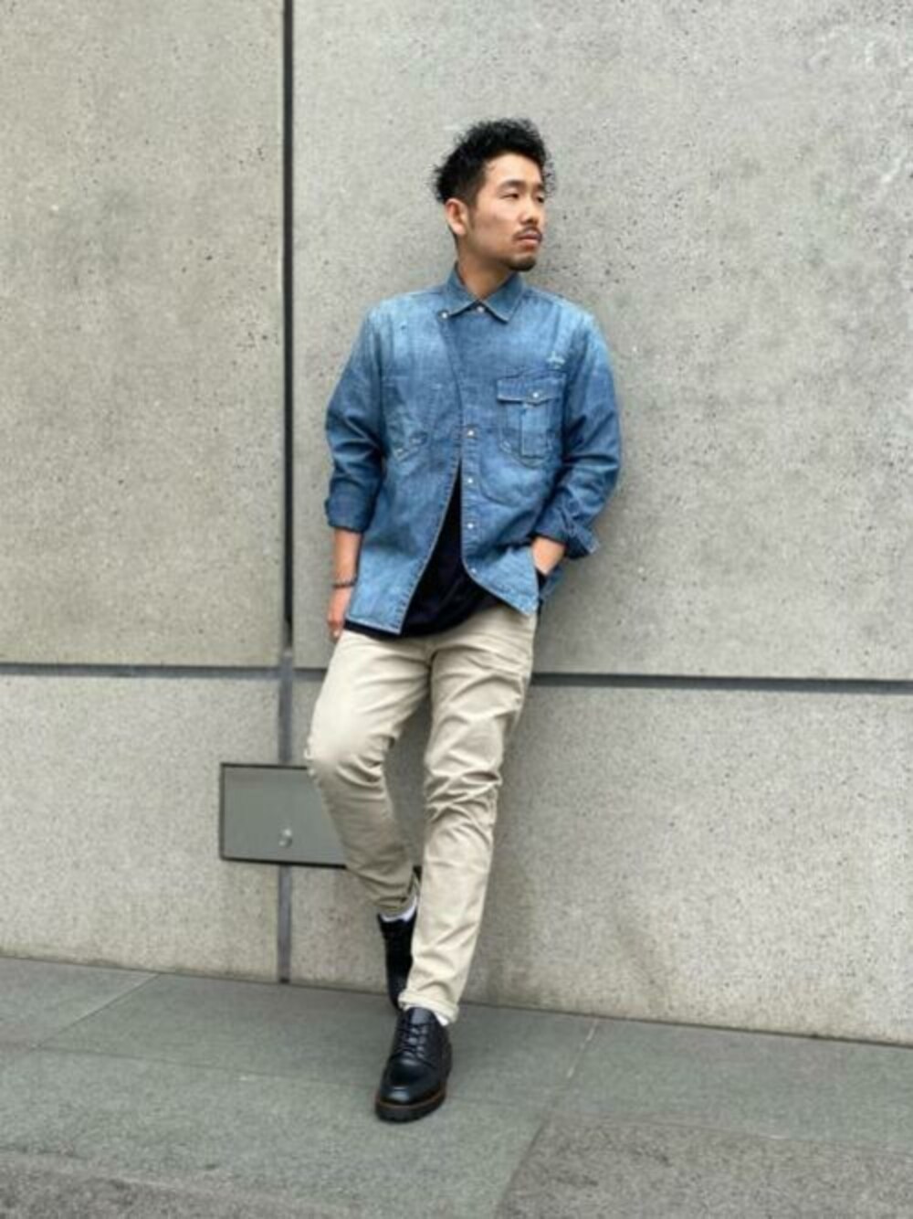 新着商品を使ったコーディネート。 ジーンズは、サイドと膝裏にダーツを入れ穿きやすく加工した、3D(立体裁断)タイプです! 11オンスのキャンバス生地なので涼しく穿け、春夏らしいナチュラルなベージュがデニムシャツとの相性抜群です‼️