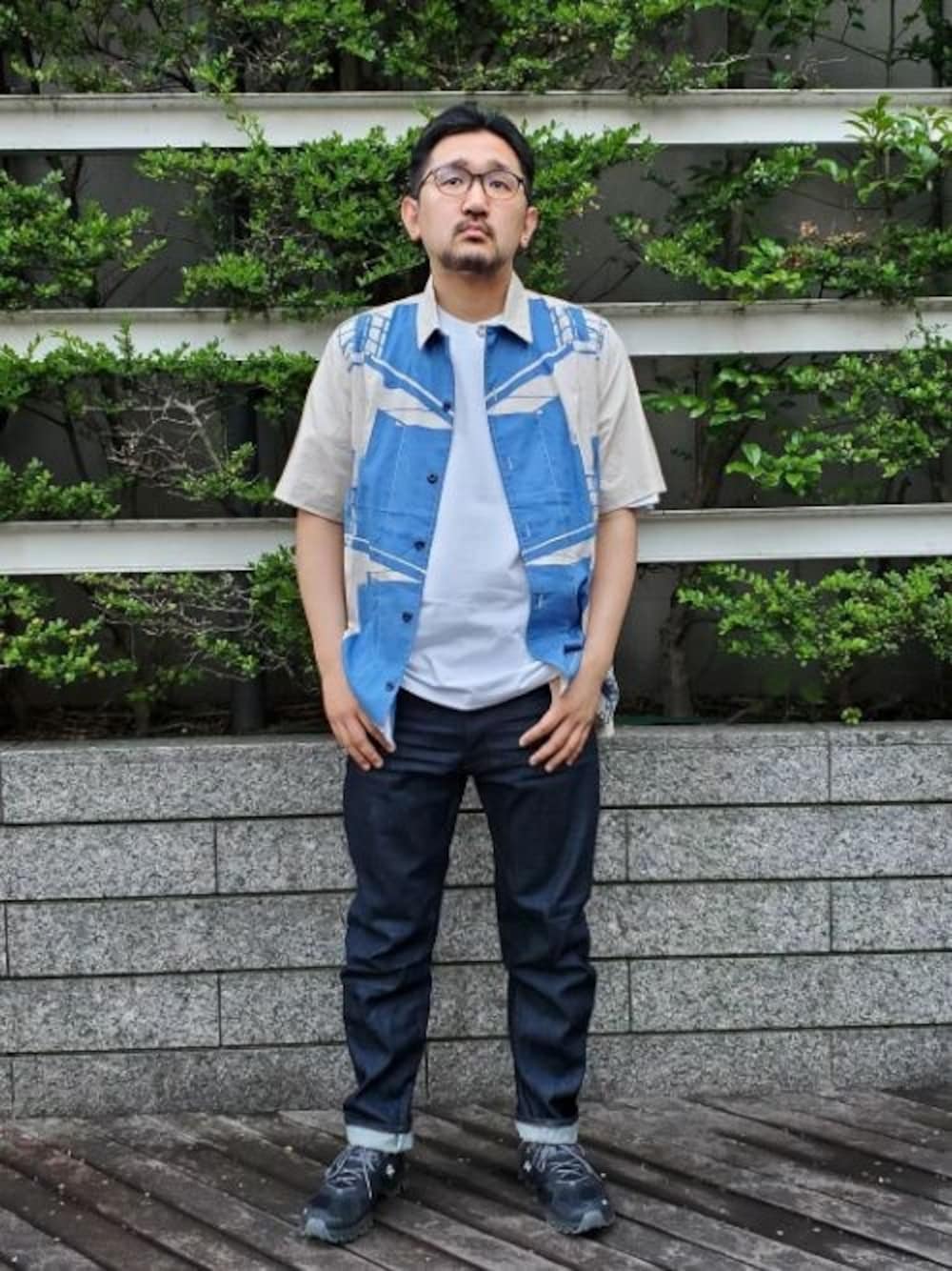 シルクのような肌触りの柄シャツを使ったコーディネート。 合わせたリジッドデニムは、しっかりとした生地感の経年変化を楽しめるアイテムです。
