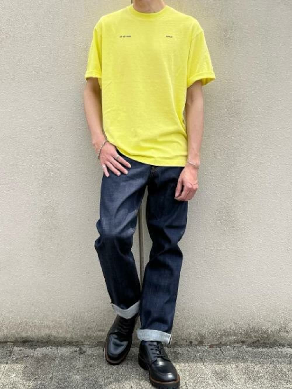 夏の日差しに映えるイエローのオーバーサイズTシャツと、セルビッジジーンズを合わせた、シンプルカジュアルコーデ。
