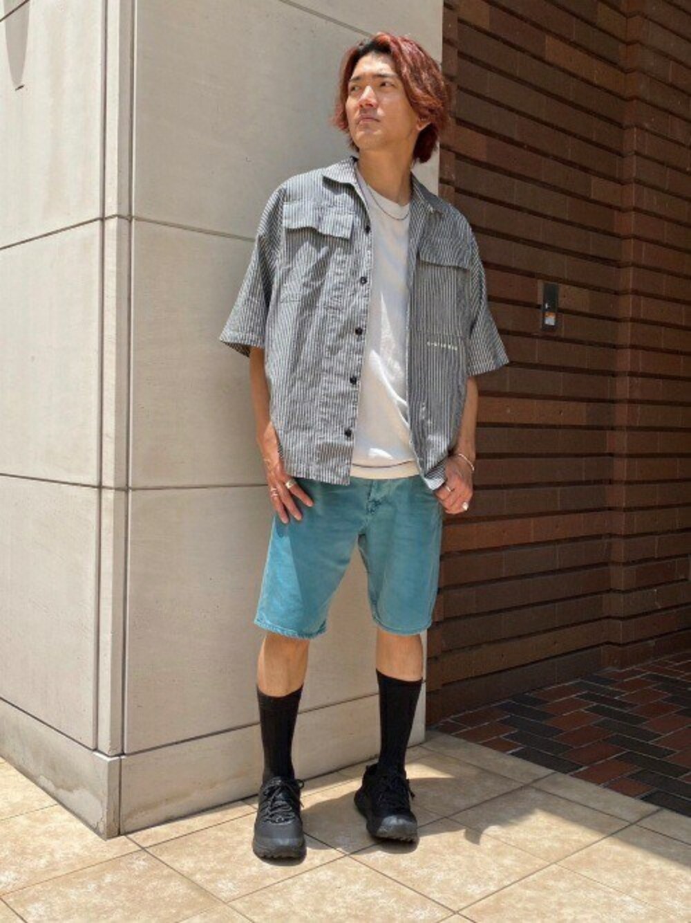 【Recommend Item】 半袖シャツ・ショーツを使ったサマーコーディネートをご紹介いたします。 ストライプが印象的なシャツはサマーコーデらしくキレイなブルーのショーツと 合わせるのが季節感を出せてとってもおすすめ!! シャツのボタンの色を(ブラック)足元のスニーカーで拾ってあげ、細部までこだわっています。