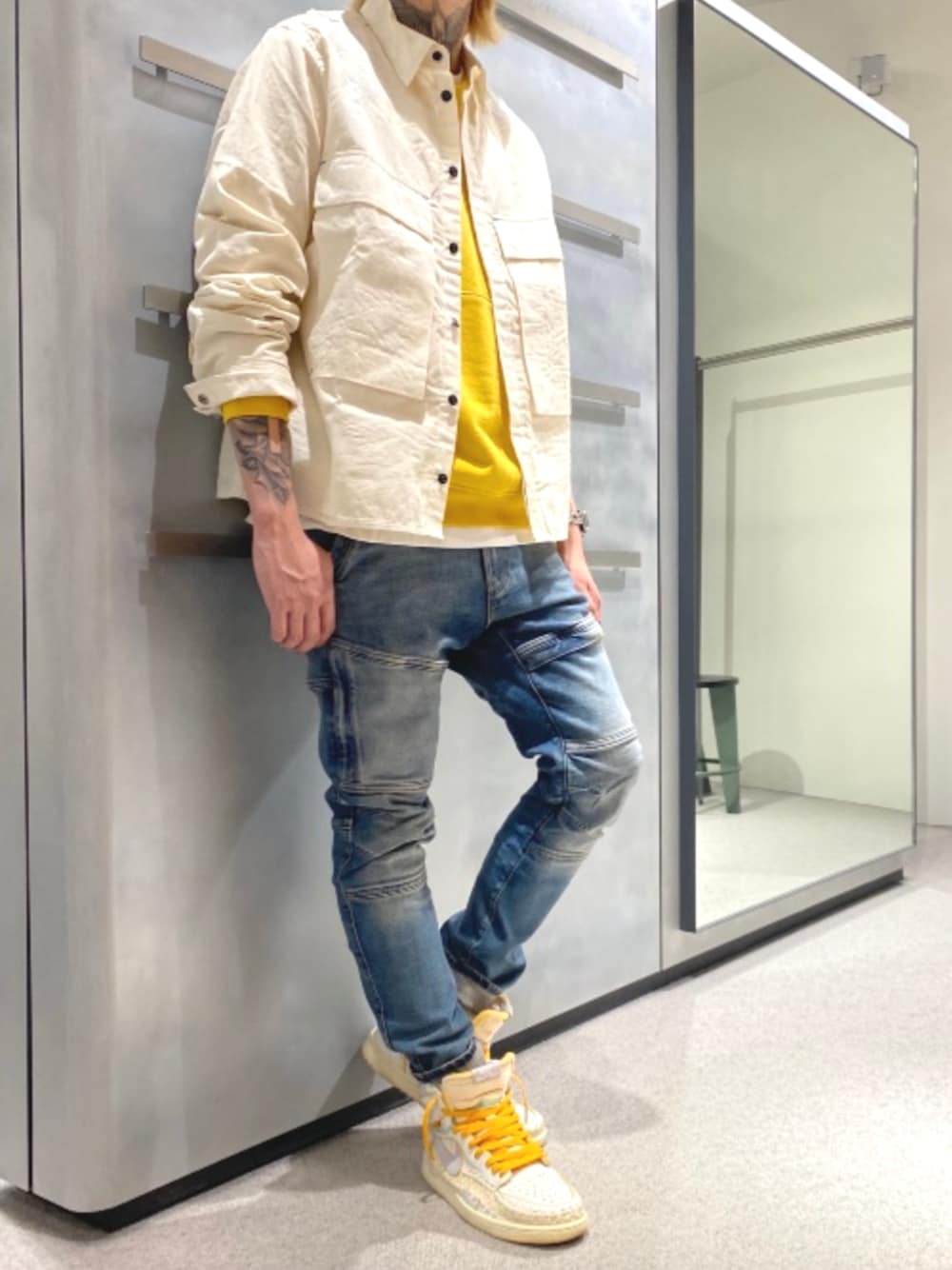 春らしい柔らかいカラーのシャツは、あえてインナーにメリハリのあるカラーを合わせて全体がぼやけないようにコーデを組んでみました。ボトムには新作のRackamを合わせて春ムードに。程よくヴィンテージ感のあるRackamは、ダークトーンのコーデにも合わせやすく今季おすすめの新作です。 スタッフ身長183㎝