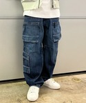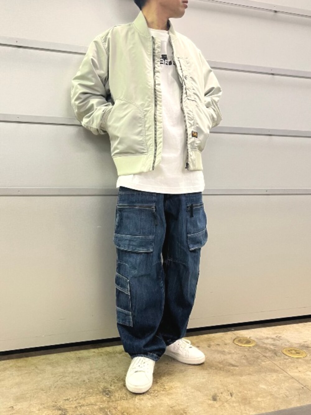 MA1タイプのミリタリーブルゾンにルーズなデニムカーゴを合わせたカジュアルコーデ。