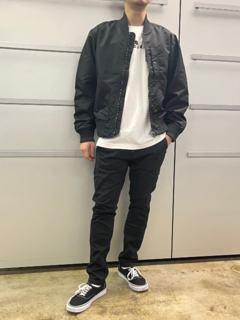 MA1タイプのミリタリーブルゾンにスリムジーンズのモノトーンコーデ。