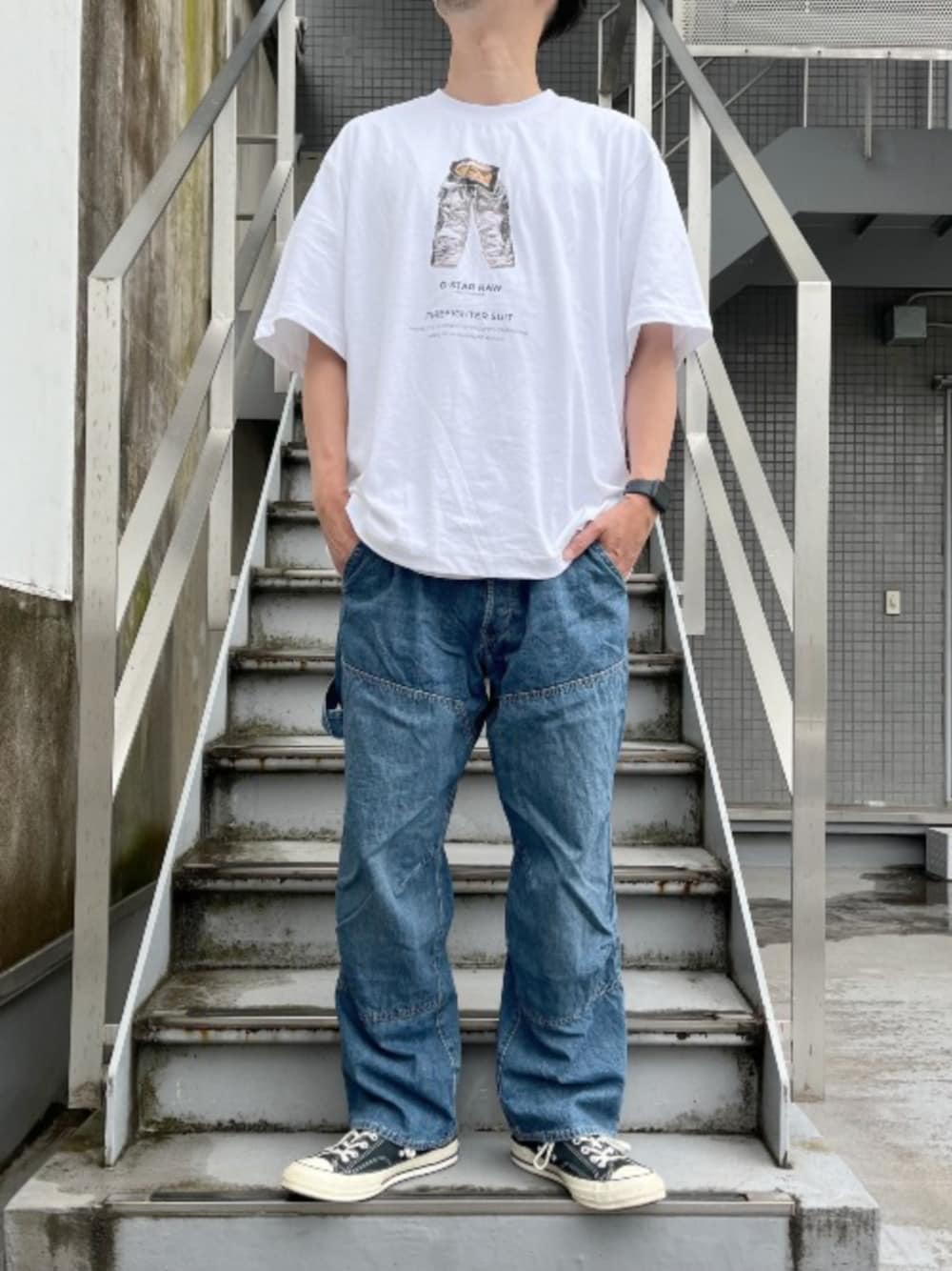 日本限定のワイドカーペンタージーンズとオーバーサイズのグラフィックTでリラックスしたカジュアルコーデ。